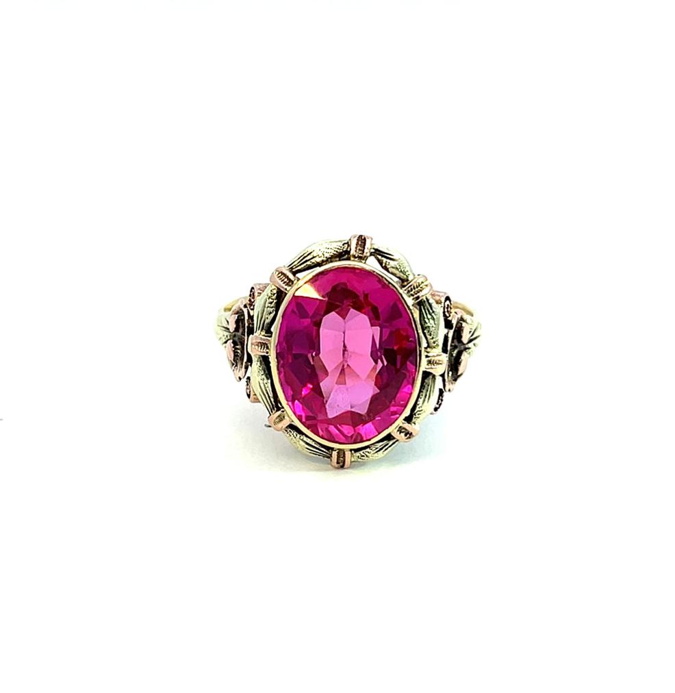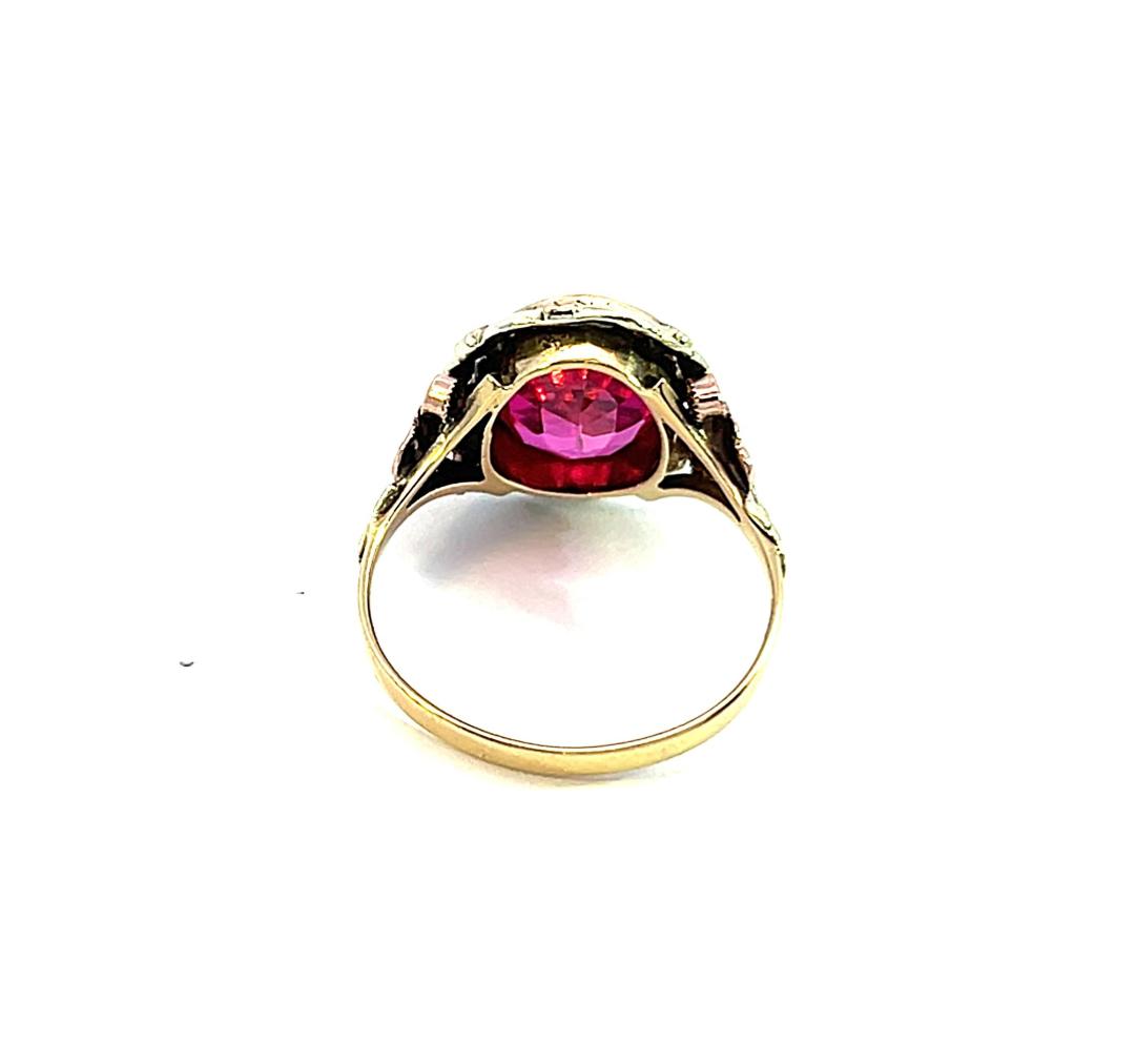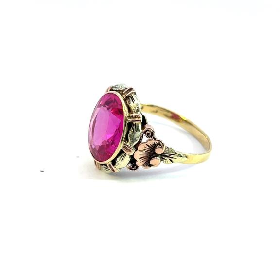 Prsten z kombinace žluého a růžového zlata o ryzosti 585/1000, punc lvíček. Velikost 54, váha 4,26 g, rozměr hlavy prstenu 16 x 15 mm. Kámen je syntetický.