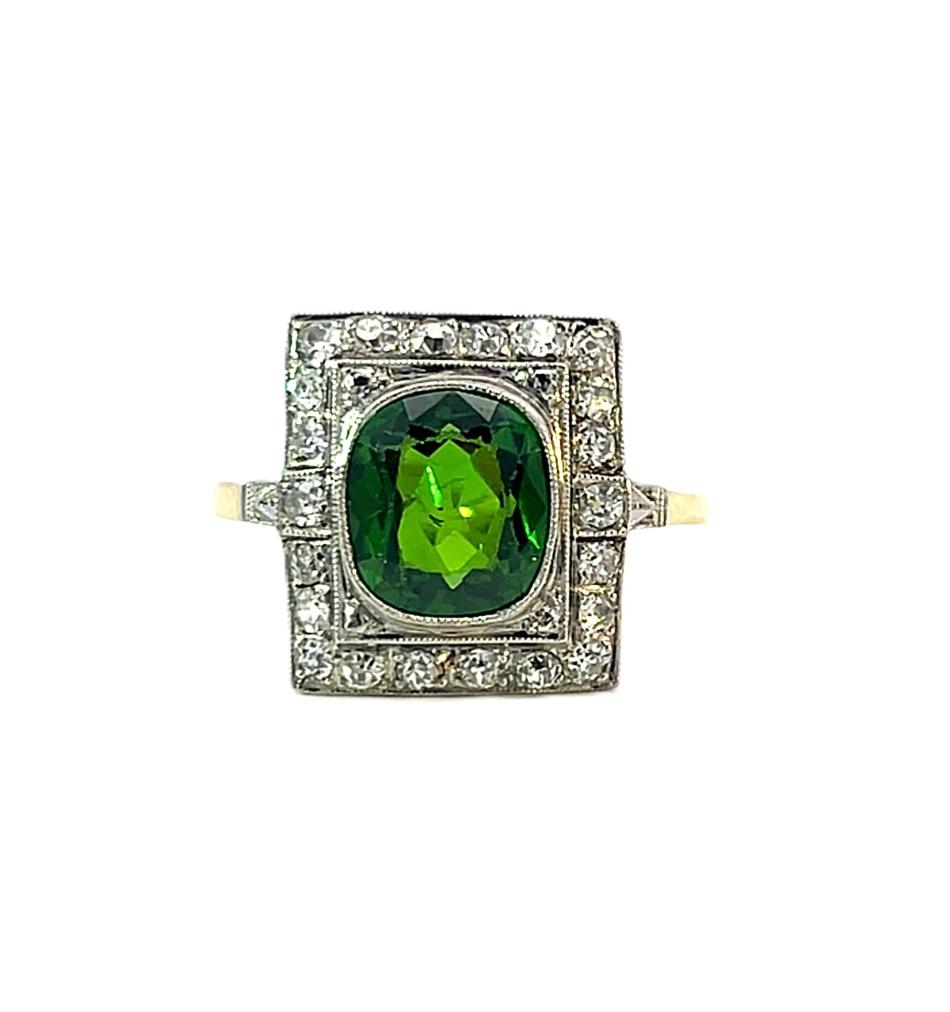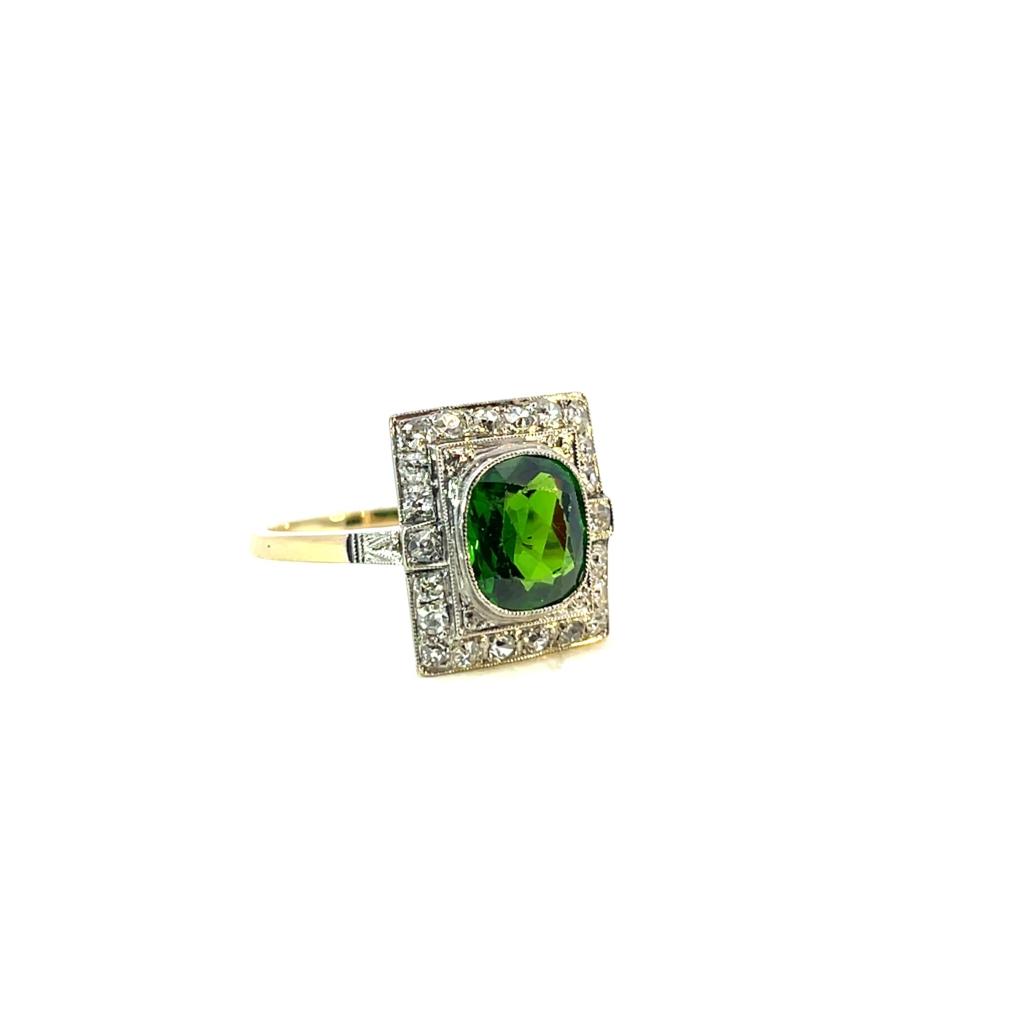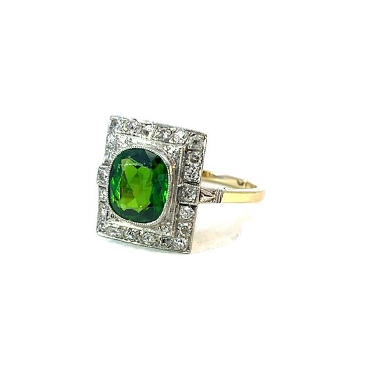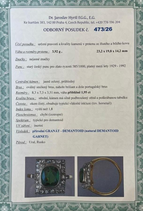 Prsten z kombinace žlutého a bílého zlata o ryzosti 585/1000, punc lvíček. Váha 3,92 g, velikost 54, rozměr hlavy prstenu 14 x 13 mm. Kámen - přírodní granát - demantoid oválného smíšeného brusu - 1 ks, cca 1,95 ct, země původu: Ural. Kámen - přírodní diamant briliantového brusu - 22 ks, cca 0,02 ct každý - dohromady cca 0,44 ct.