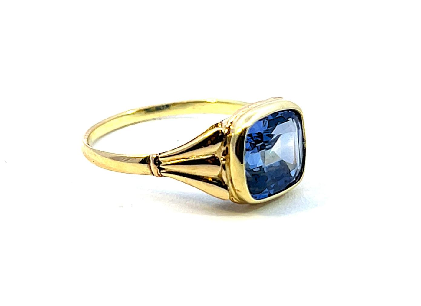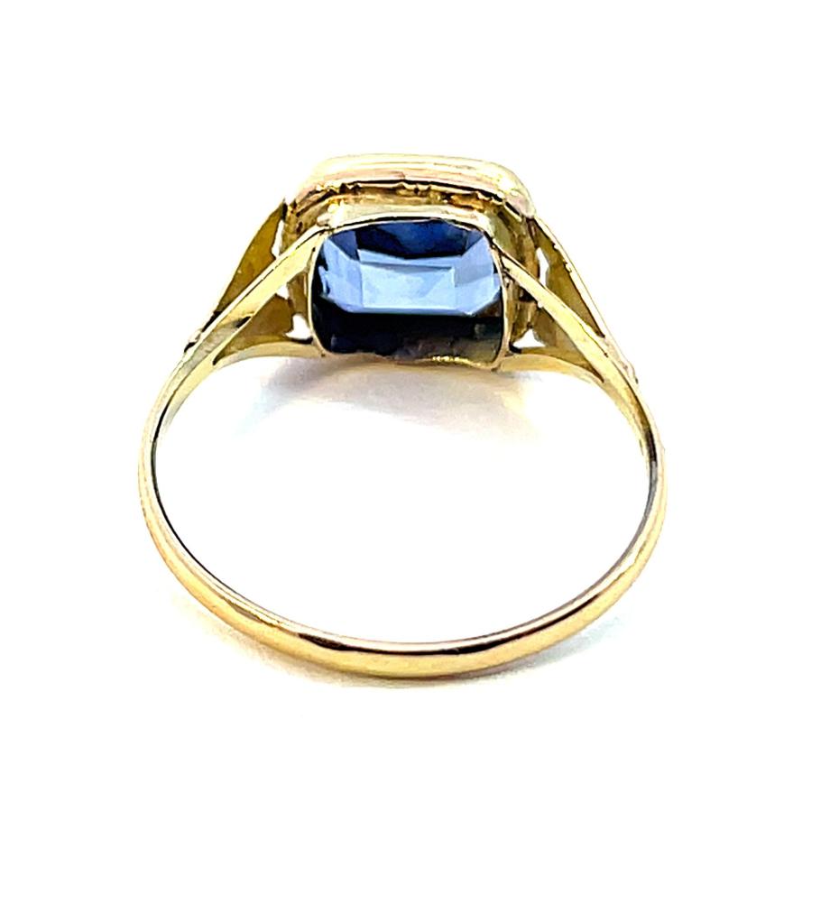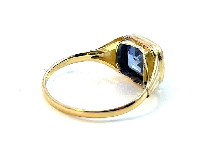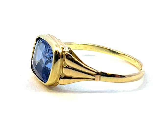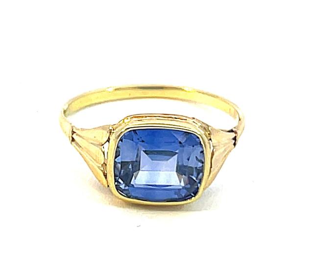 Zlatý prsten o ryzosti 585/1000, punc čejka. Váha 2,52 g, velikost 57, v nejširším bodě 9,5 mm. Kámen je syntetický.