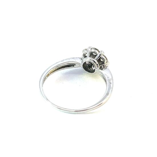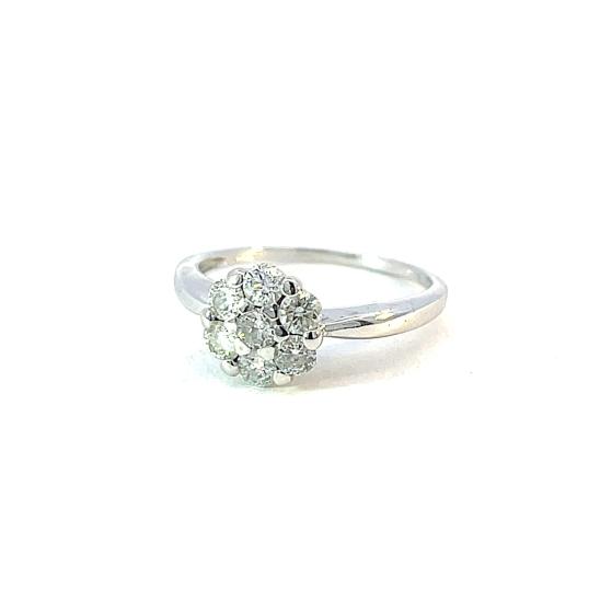 Prsten z bílého zlata o ryzosti 750/1000, punc kohout. Váha 2,49 g, velikost 51, průměr ozdoby 8 mm. Kámen - přírodní diamant briliantového brusu - 7 ks, dohromady cca 0,55 ct.