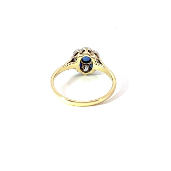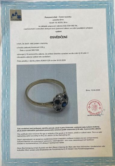 Prsten z kombinace žlutého a bílého zlata o ryzosti 585/1000, osvědčení z PÚ. Váha 2,06 g, velikost 52, průměr ozdobné části 9 mm. Kámen - syntetický safír - 5 ks. Kámen - přírodní diamant staroevropského brusu - 4 ks, dohromady cca 0,25 ct.