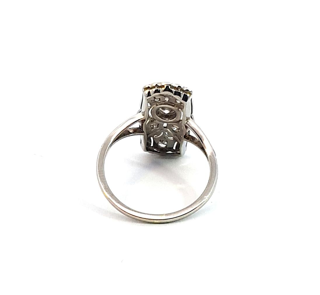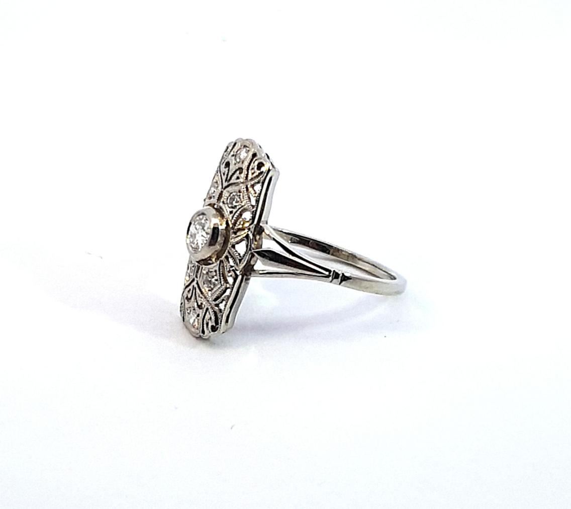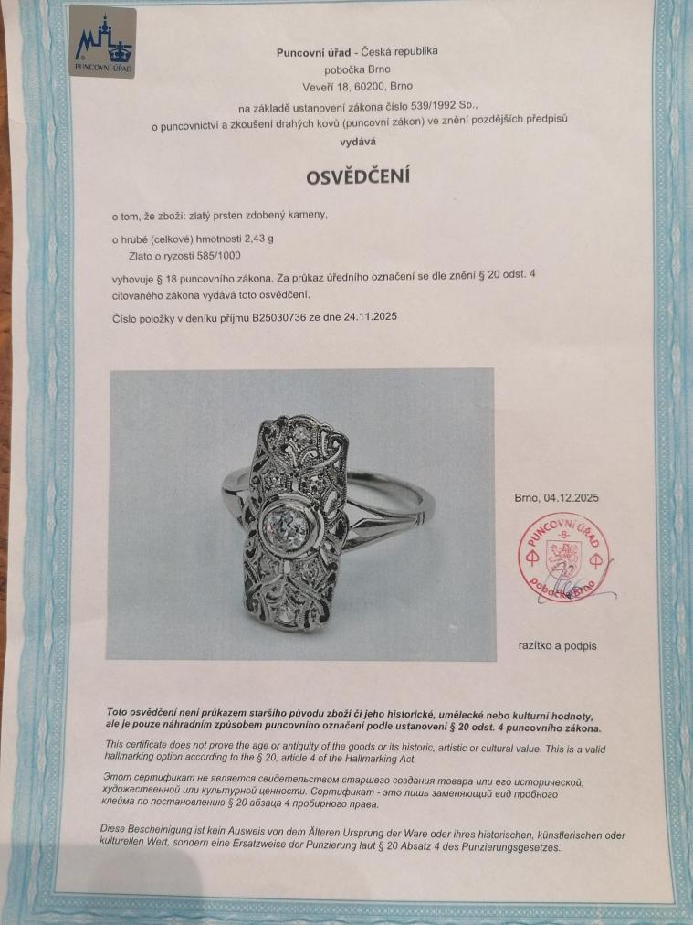 Prsten z bílého zlata o ryzosti 585/1000, osvědčení z PÚ. Váha 2,44 g, velikost 52, rozměr hlavy prstenu 19 x 9,5 mm. Kámen - přírodní diamant briliantového brusu - 7 ks, centrální kámen: 1 ks, cca 0,20 ct, ostatní kameny: 6 ks, cca 0,02 ct každý - dohromady cca 0,32 ct.