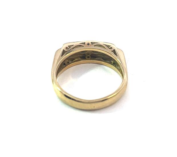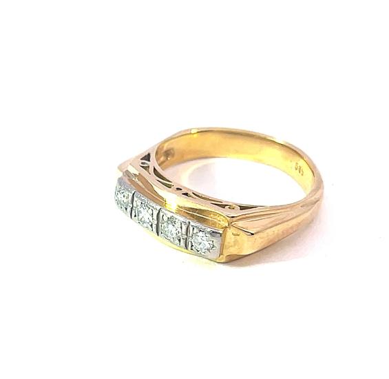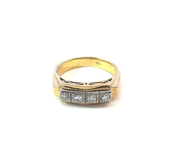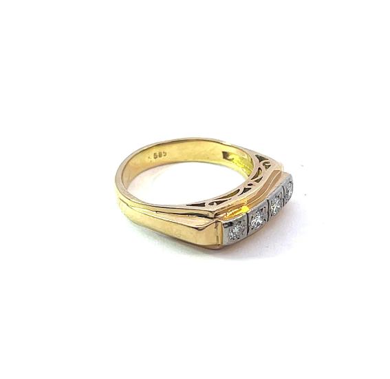 Prsten z kombinace žlutého a bílého zlata o ryzosti 585/1000, punc labuť. Velikost 53, váha 5,0 g, v nejširším bodě 6 mm. Kámen - přírodní diamant briliantového brusu - 4 ks, dohromady cca 0,23 ct.