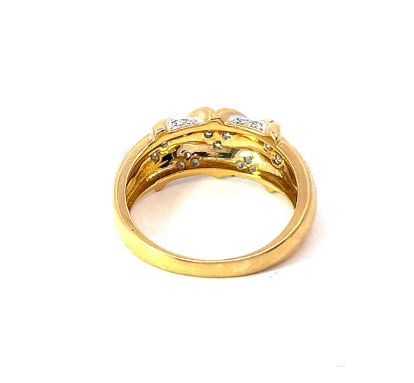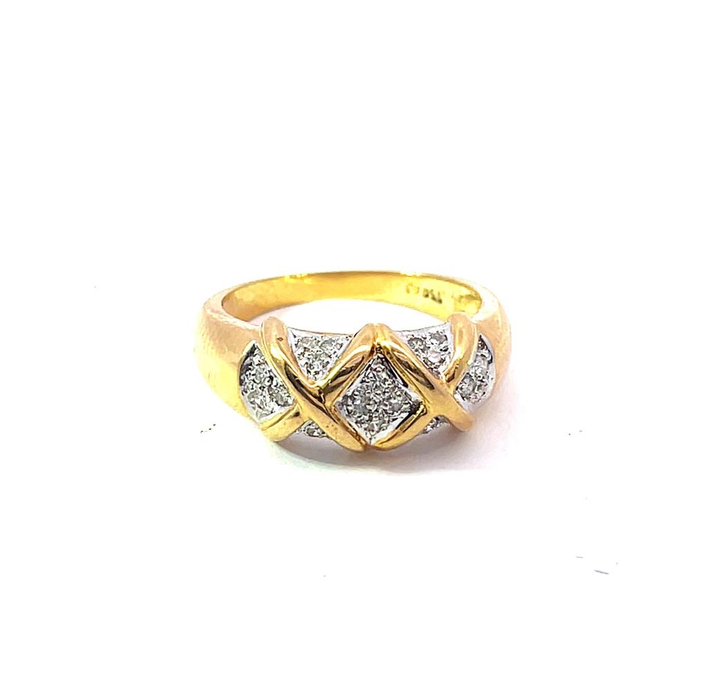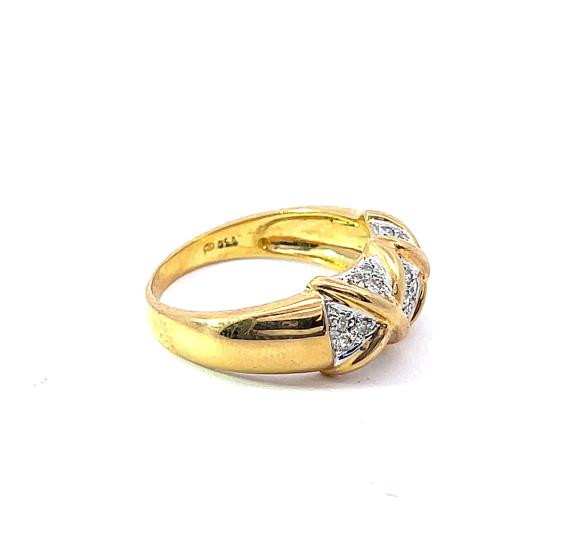Prsten o ryzosti 750/1000, punc kohout. Velikost prstenu je 55,5, váha 6,66 g, v nejširším bodě má 10 mm. Kameny - přírodní diamanty celkem 22 ks briliantového brusu o váze 0,02 ct každý, cekĺkem tedy 0,44 ct.