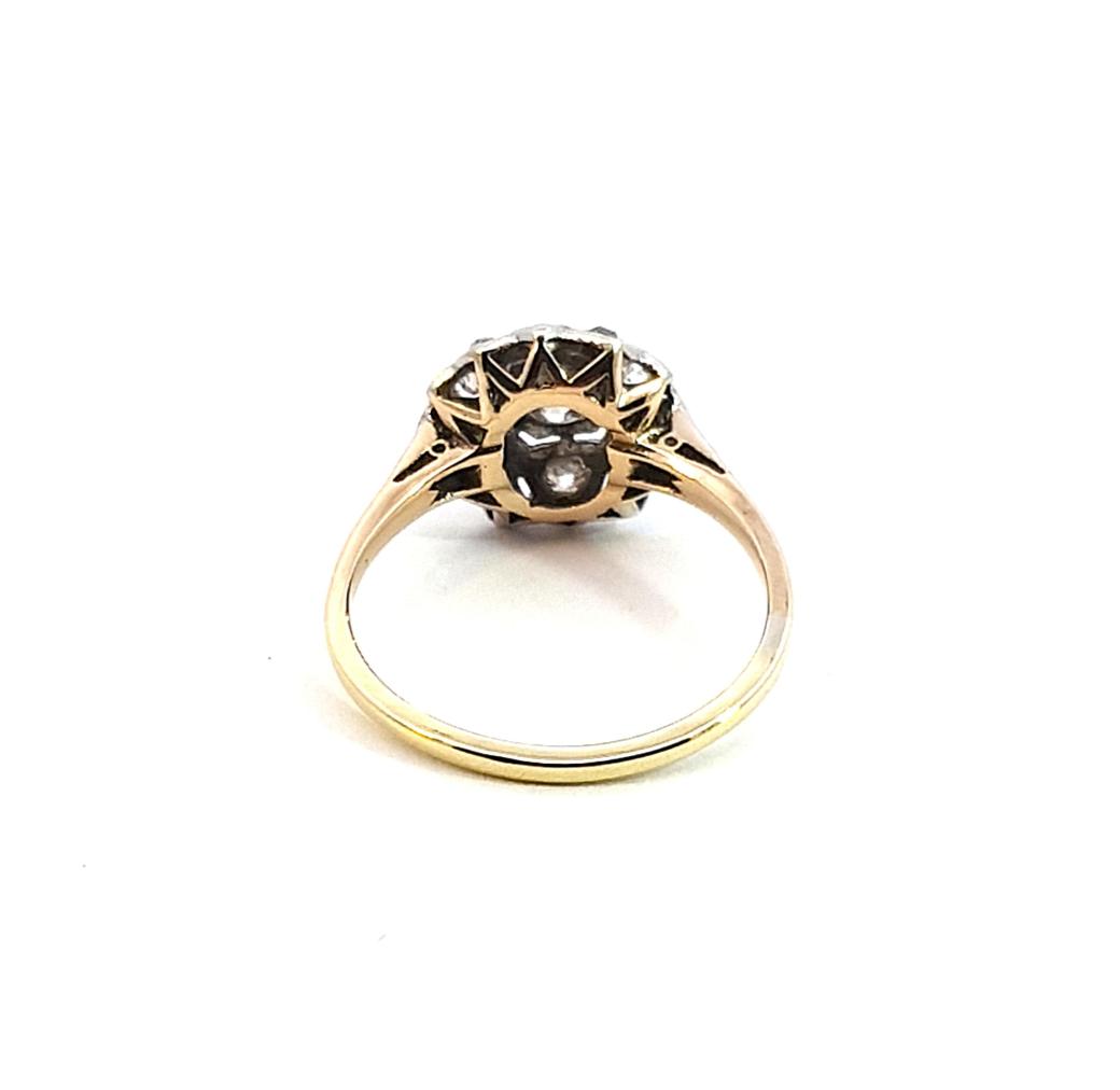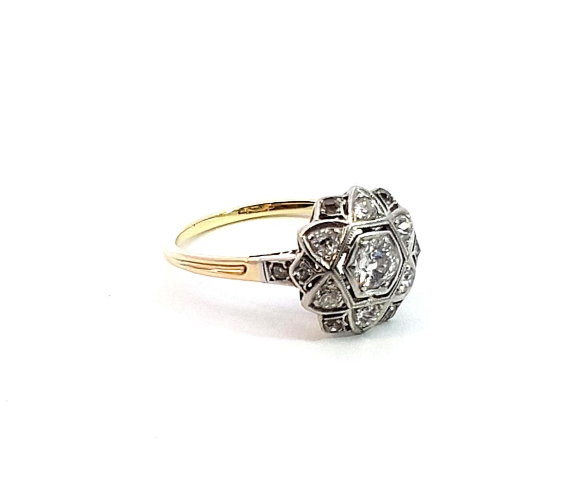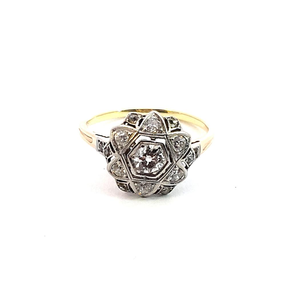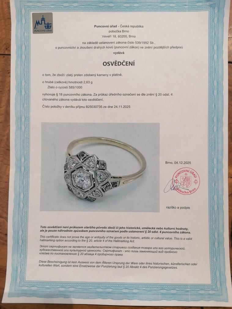Prsten z kombinace zlata o ryzosti 585/1000 a platiny (zasazení kamenů), osvědčení z PÚ. Velikost 55, váha 2,64 g, průměr hlavy prstenu 12 mm. Kámen - přírodní diamant staroevropského brusu - 7 ks, centrální kámen: 1 ks, cca 0,20 ct, okolní kameny: 6 ks, cca 0,05 ct každý - dohromady cca 0,50 ct. Kámen - přírodní diamat routa - 8 ks.