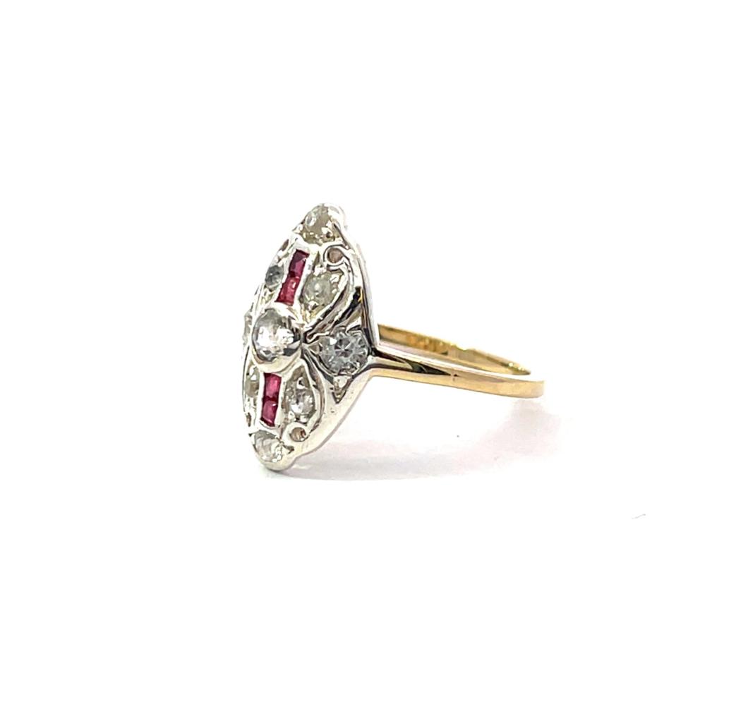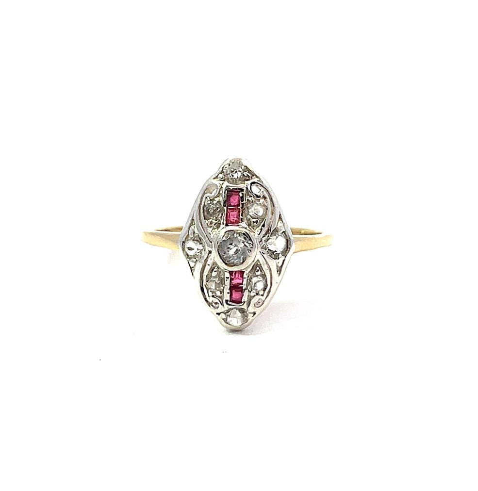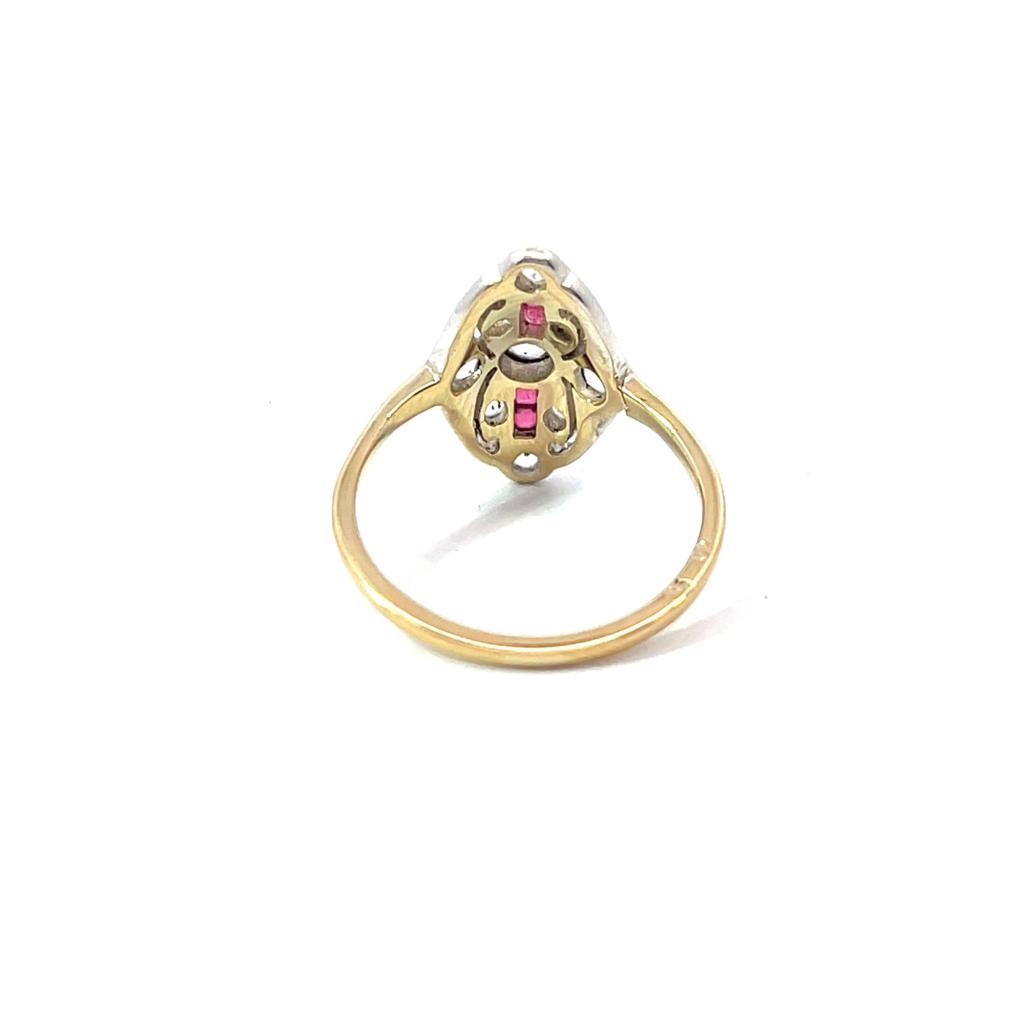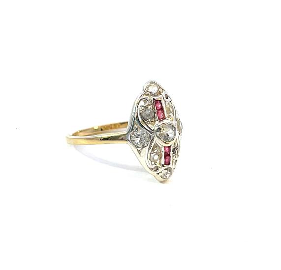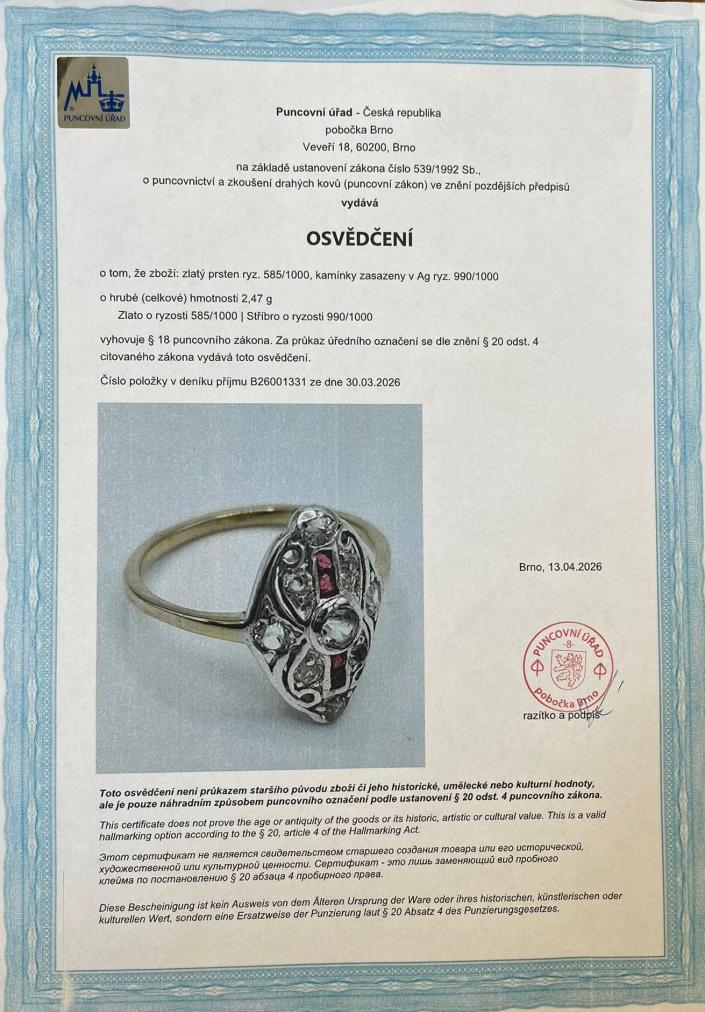 Prsten z kombinace zlata o ryzosti 585/1000 a stříbra o ryzosti 990/1000 (zasazení kamenů), osvědčení z PÚ. Váha 2,47 g, velikost 52, rozměr hlavy prstenu 16 x 11 mm. Šína je v jednom místě u hlavy prstenu prasklá. Kameny jsou syntetické.