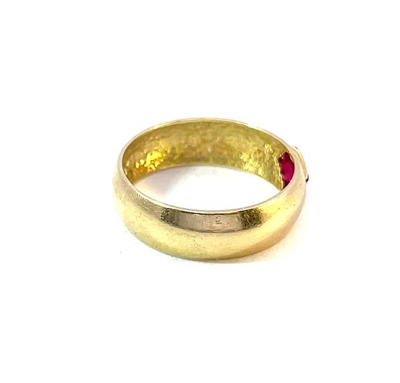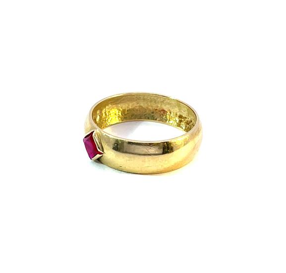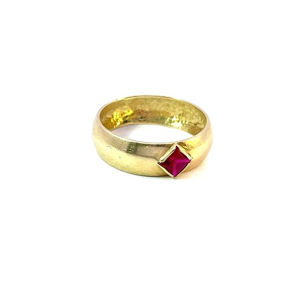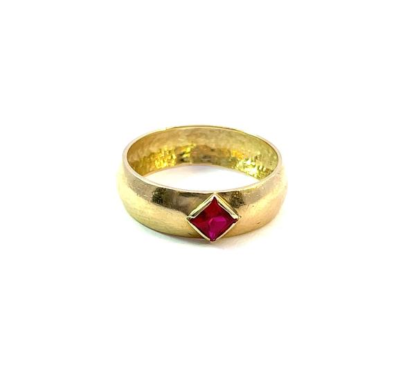 Zlatý prsten o ryzosti 585/1000, punc labuť. Velikost 56, váha 2,90 g, v nejširším bodě 6 mm. Kámen je syntetický.