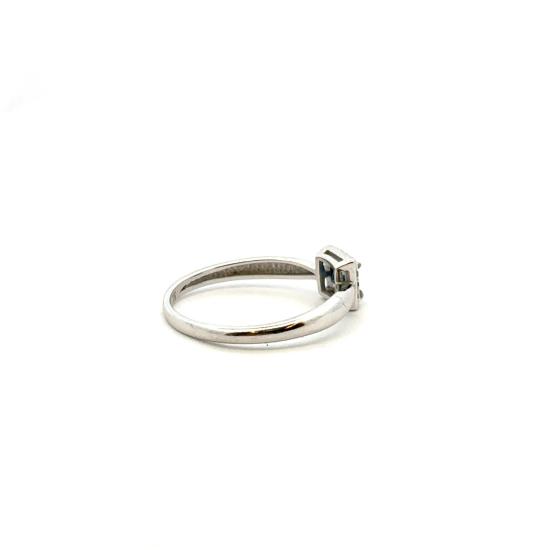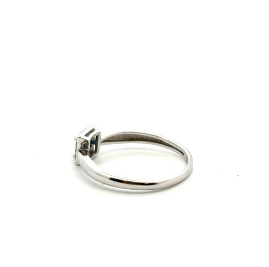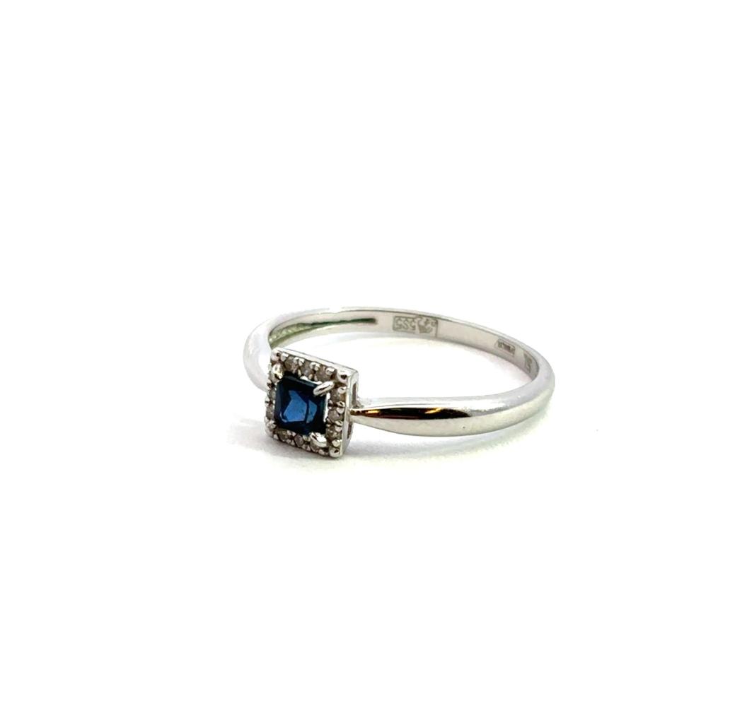 Prsten z bílého zlata o ryzosti 585/1000, punc labuť. Velikost 51, váha 1,54 g, rozměr hlavy prstenu 6 x 6 mm. Kámen - syntetický safír - 1 ks. Kámen - přírodní diamant briliantového brusu - 12 ks, cca 0,0025 ct každý - dohromady cca 0,03 ct.