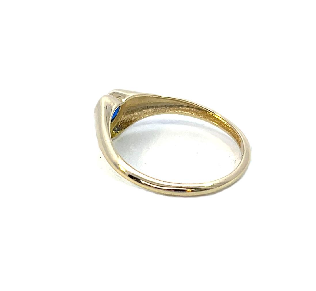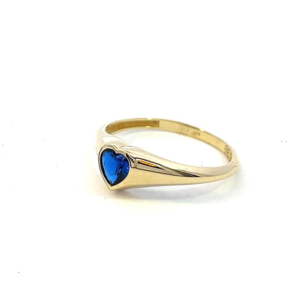 Zlatý prsten s modrým kamenem ve tvaru srdce. Zlato o ryzosti 585/1000 s puncem labuť. Váha 1,61g, velikost 57. V nejširším bodě 7 mm. Kámen je syntetický.