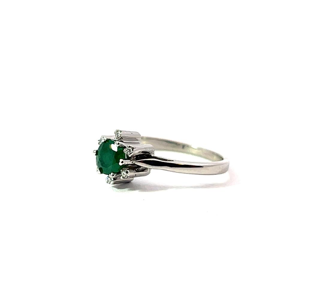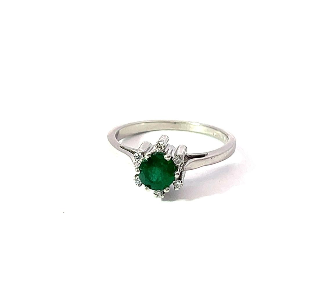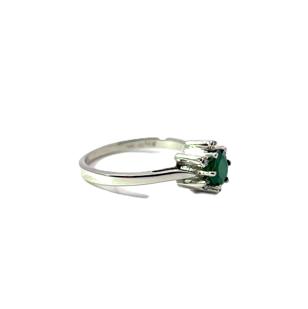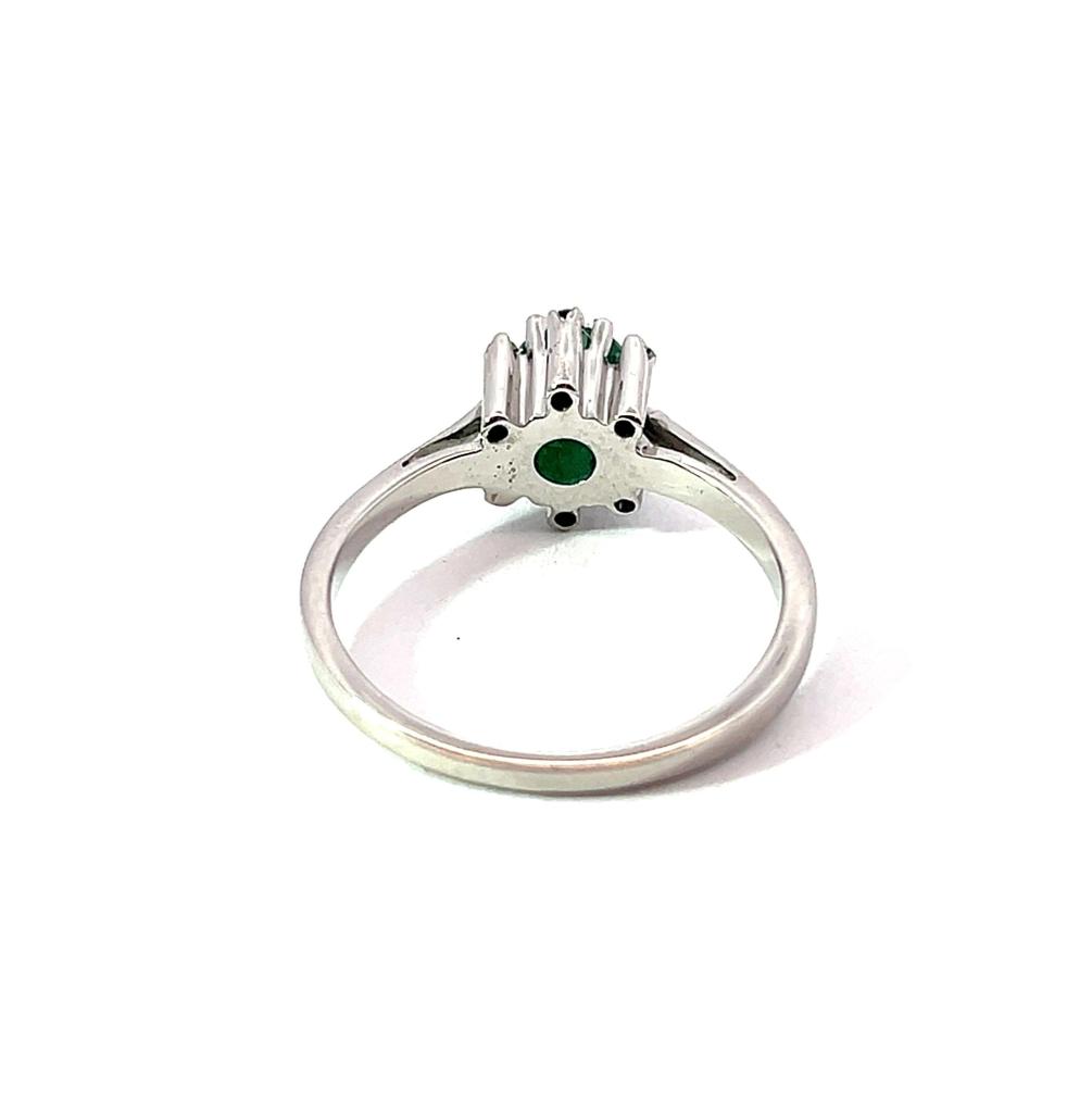 Prsten z bílého zlata o ryzosti 585/1000, punc labuť. Velikost 52, váha 2,93 g, průměr hlavy prstenu 8 mm. Kámen - smaragd - 1 ks. Kámen - přírodní diamant briliantového brusu - 6 ks, cca 0,005 ct každý - dohromady cca 0,03 ct.