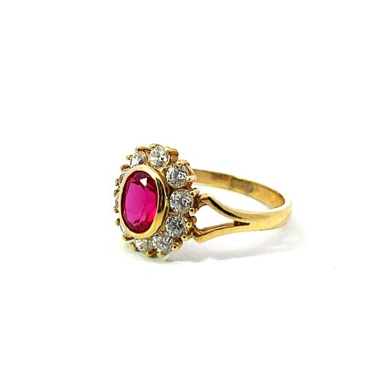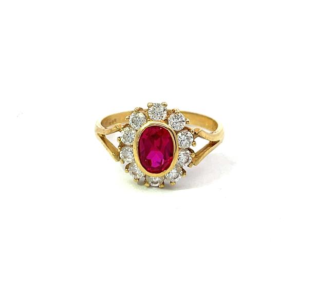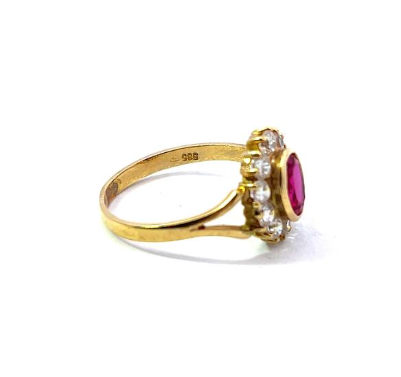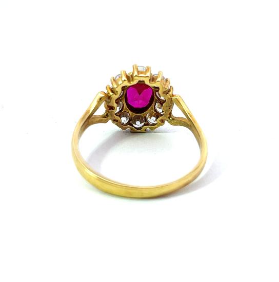Zlatý prsten o ryzosti 585/1000, punc labuť. Velikost 58, váha 3,05 g, rozměr hlavy prstenu 13 x 11,5 mm. Kameny jsou syntetické.