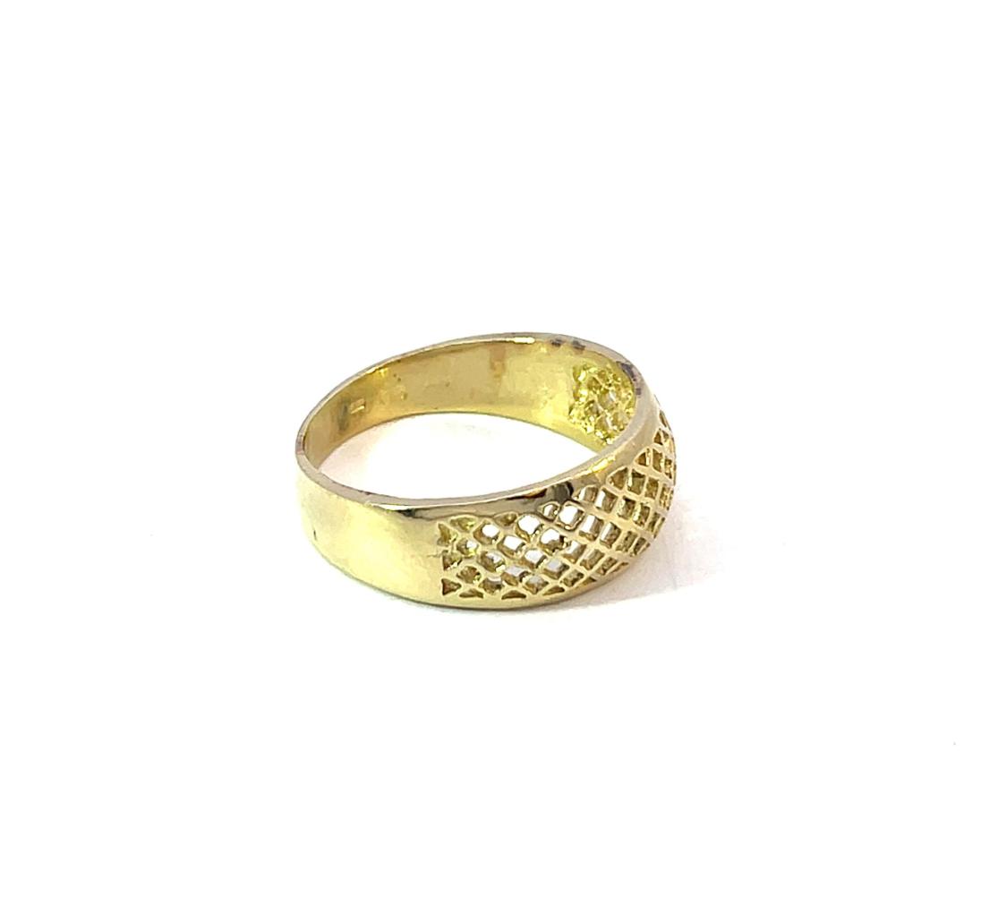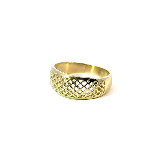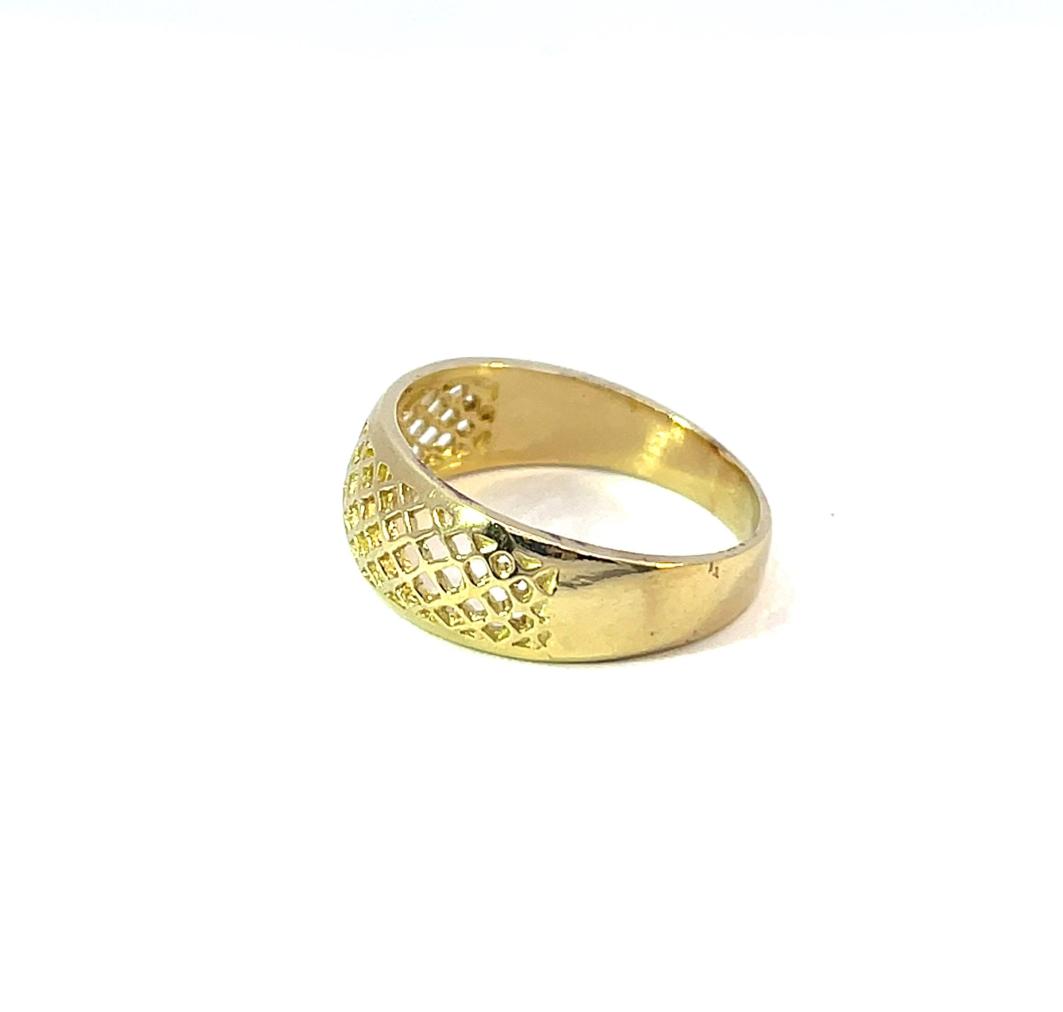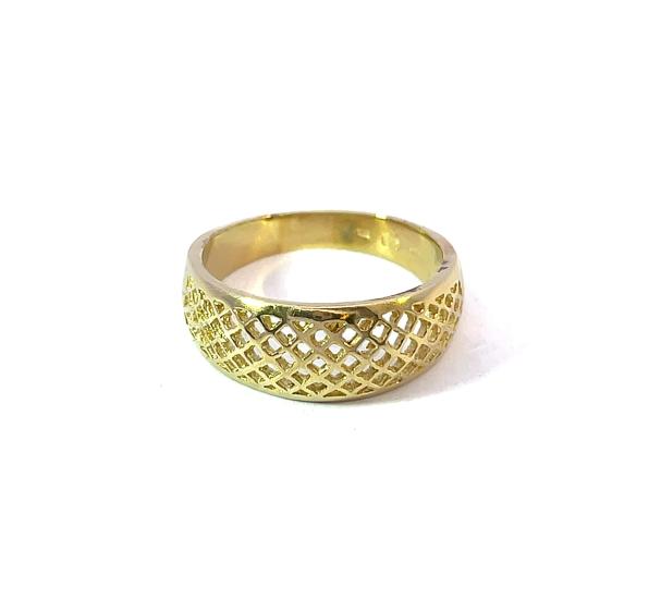 Zlatý prsten o ryzosti 585/1000, punc labuť. Velikost 55, váha 3,82 g, v nejširším bodě 8 mm.