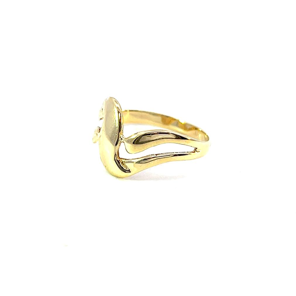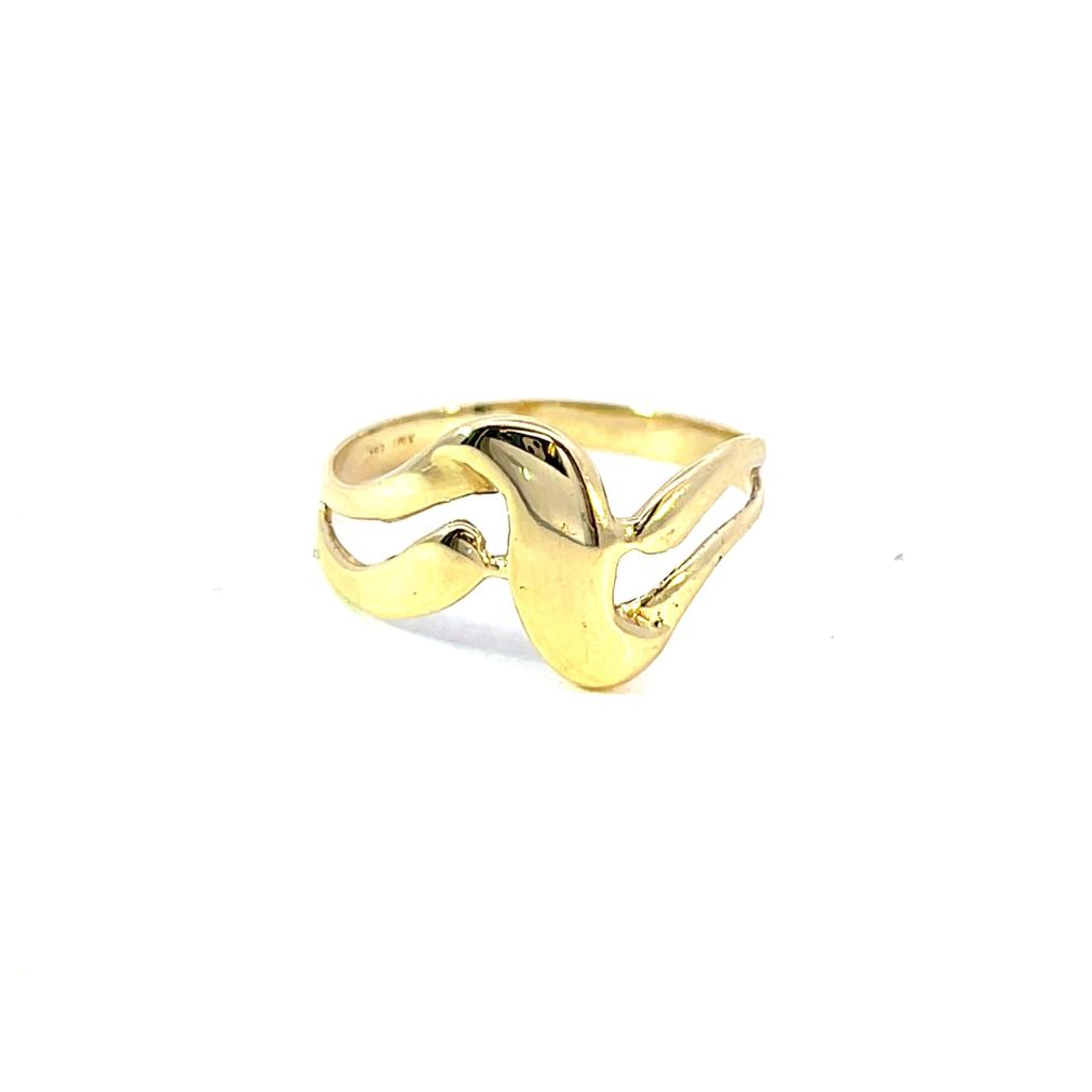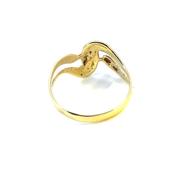 Zlatý prsten o ryzosti 585/1000, punc labuť. Váha 2,02 g, velikost 56, v nejširším bodě 12 mm.