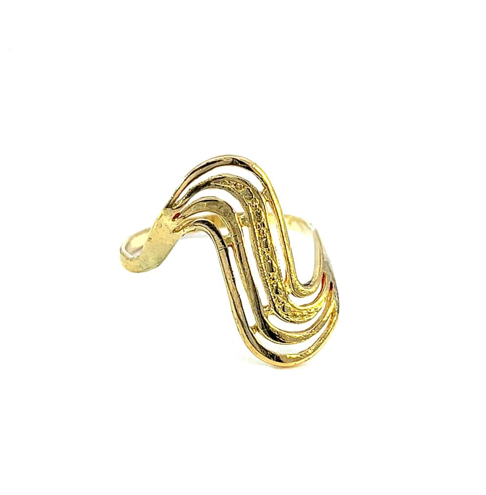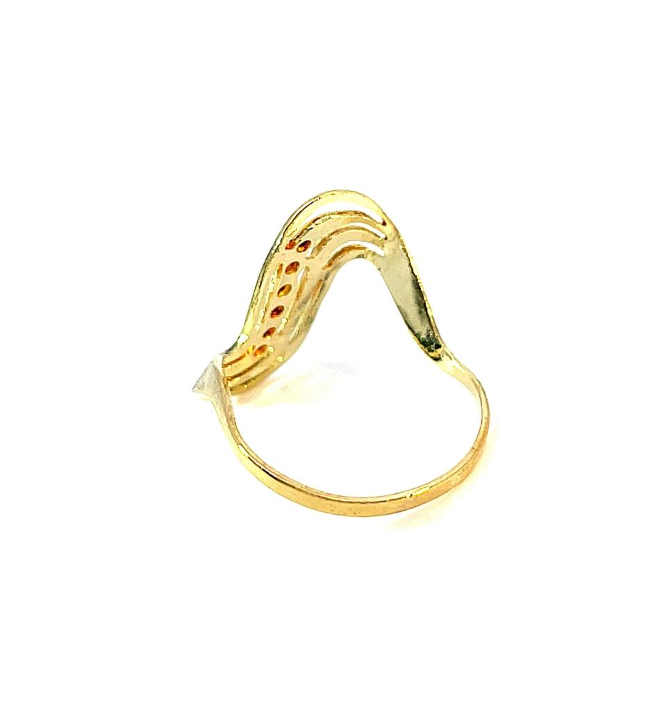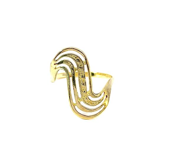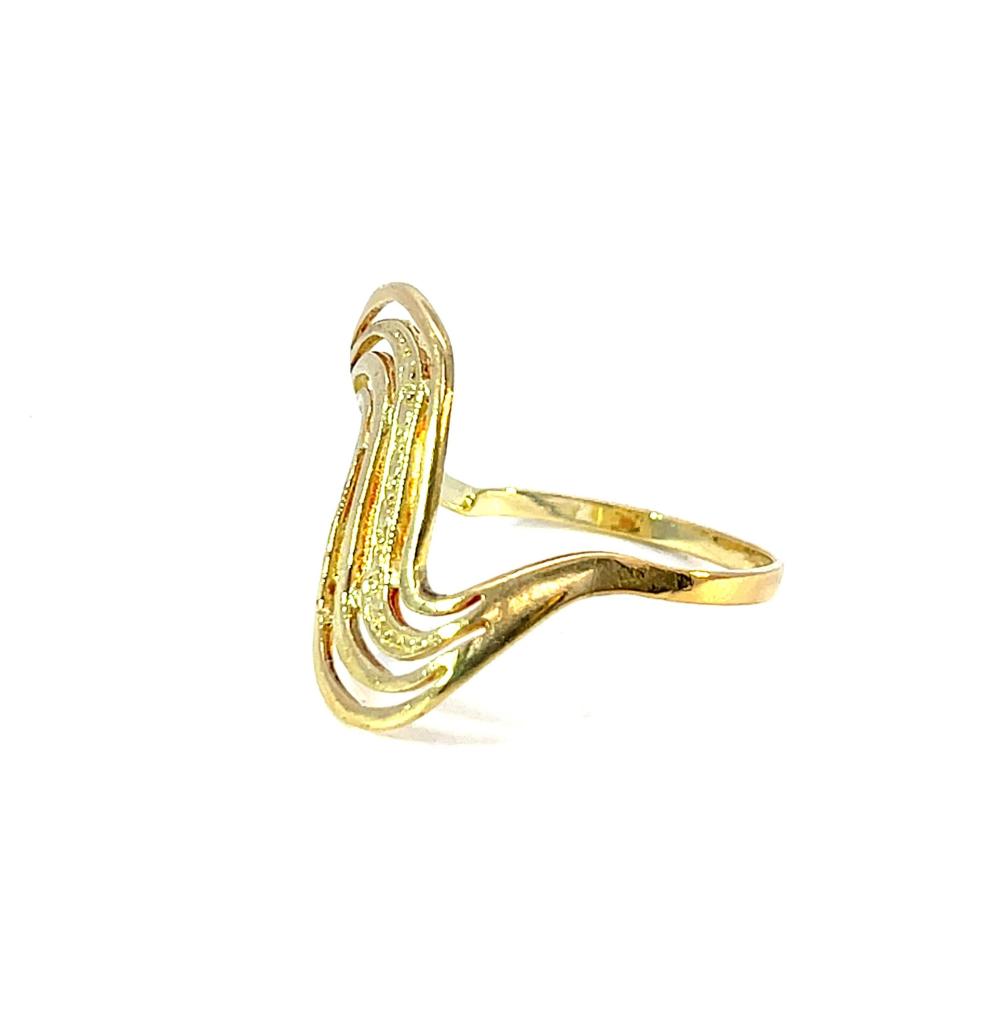 Zlatý prsten o ryzosti 585/1000, punc labuť. Váha 2,46 g, velikost 57, v nejširším bodě 22 mm.
