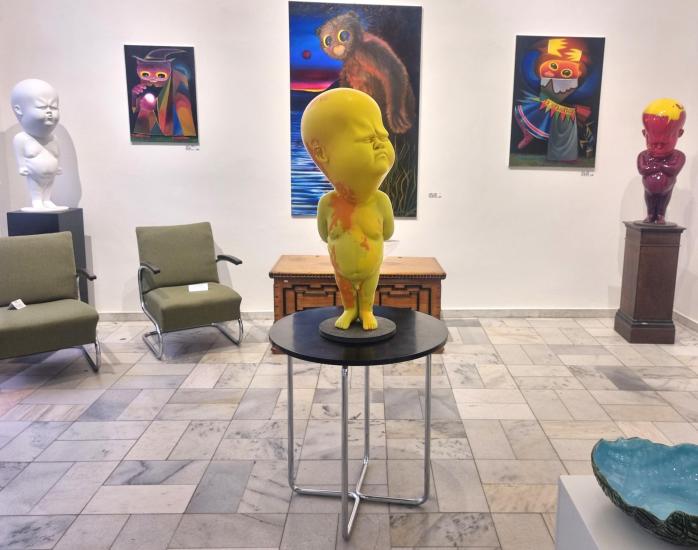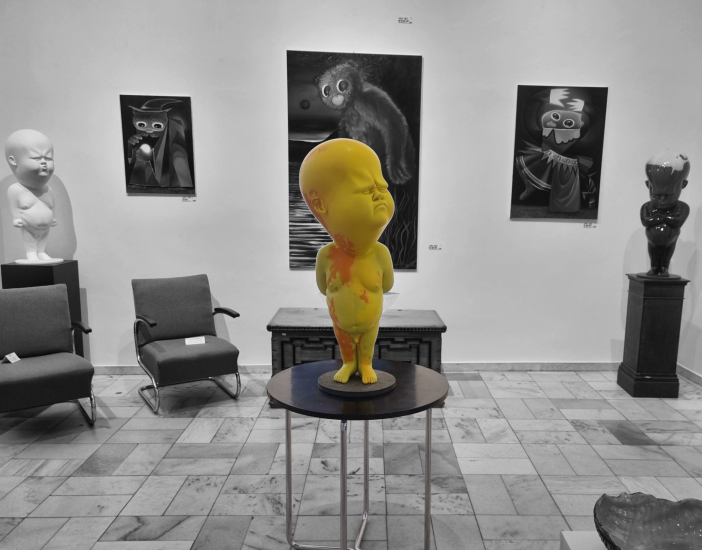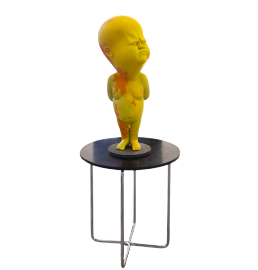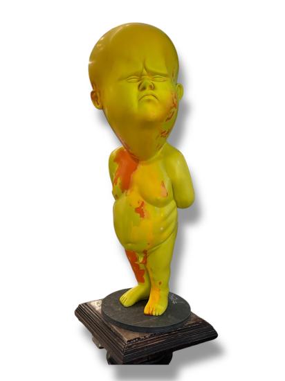 Pičus v krasně pestré žluté barvě. Originální dílo výtvarníka Viktora Freša. Rozměry 90 cm na výšku, 39 cm šířka, 30 cm průměr podstavy. Signováno na podstavci: Frešo. Materiál polyuretan.
