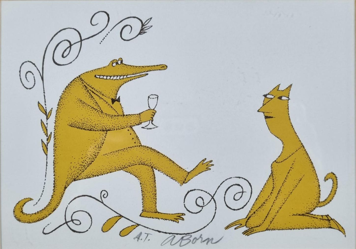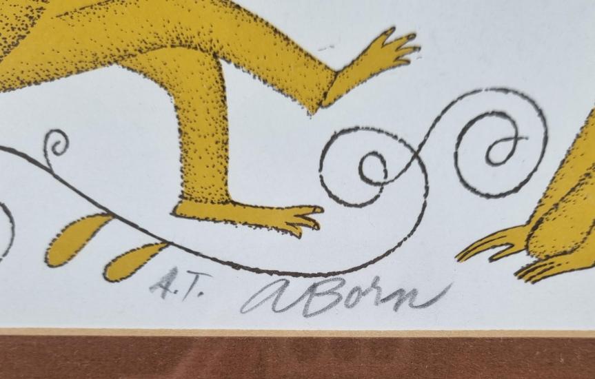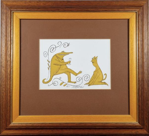 Drobné dílo od významného českého výtvarníka Adolfa Borna. Dílo nese název Námluvy, autor často pracuje s určitou dávkou vtipu, v tomto díle přetáčí klasický princip žádosti o ruku. Chimérické bytosti si vyměnili role, ženská postava klečí a žádá o ruku mužskou postavu - ta sedí s úsměvem a sklenkou na rtech naproti ní. Sérigrafie na papíře, rámováno pod sklem, rozměry s rámem 44 x 39,5 cm, rozměry díla 14 x 21 cm. Signováno dole uprostřed "A.T. Adolf Born".