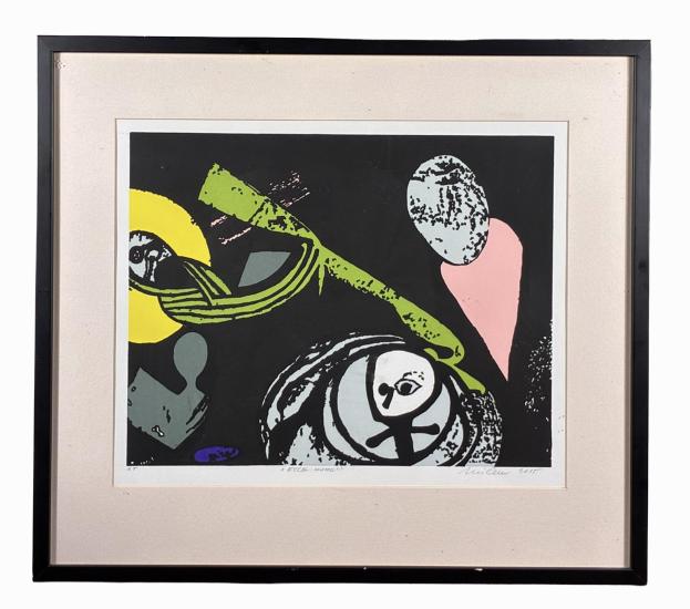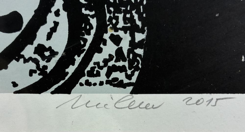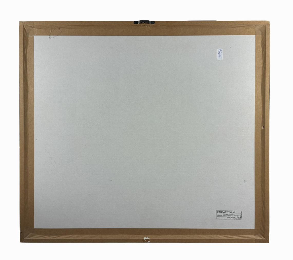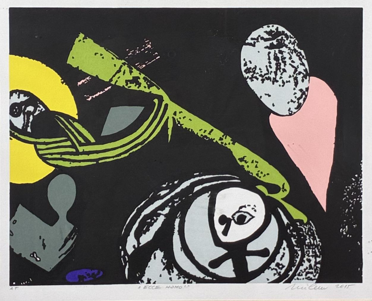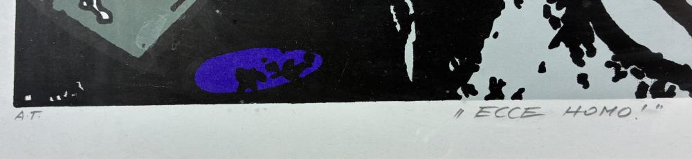 Jedná se o autorský sériový tisk od Stefana Milkova. Jednoduché tvary na tmavém pozadí připomínají art brut. Lze identifikovat dobře pouze jednu bílou postavu s velkým okem. V pravém dolním rohu se nachází signatura Milkov a letopočet 2015. Uprostřed dole se nachází nápis Ecce Homo a v levém dolním rohu se nachází zkratka A. T.. Rozměry s rámem jsou 54 cm x 48 cm a bez rámu jsou 32 cm x 39 cm. Obraz je pod sklem.
