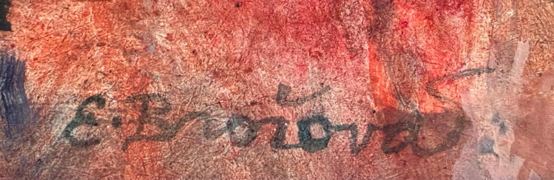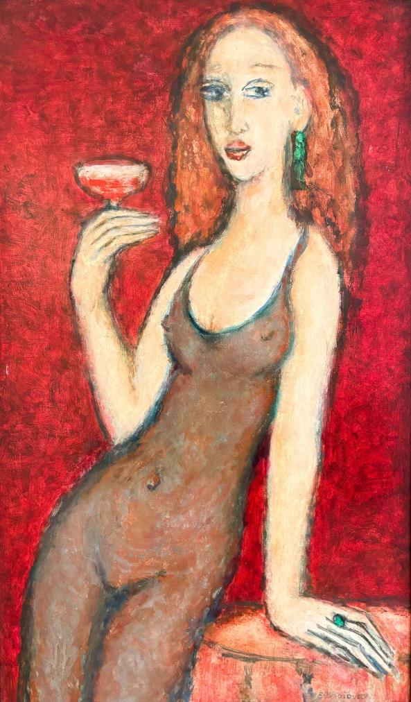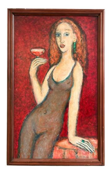 Portrét štíhlé ženy, která v rukou drží sklenku červeného vína. Dílo od akademické malířky a sochařky Evy Brožové. Olej na sololitu. Rozměry s rámem jsou 61 x 96 cm a bez 51 x 78 cm. Signatura se nachází na pravé straně dole E. Brožová.
