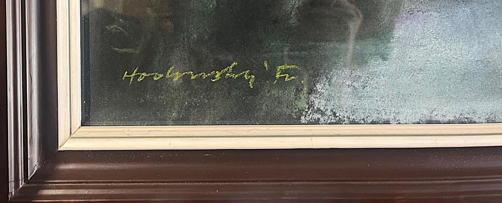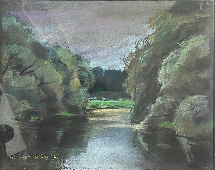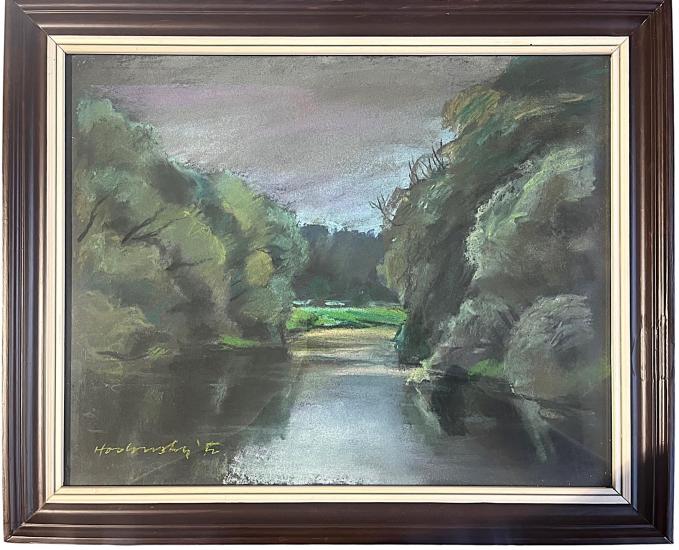 Autor zachycuje večerní krajinu s řekou a stromy, s nebem zbarveným do fialova, které se zrcadlí ve vodní hladině. Autorem je František Hodonský. Suchý pastel na papíře, rozměry s rámem 46 x 38 cm, bez rámu 38 x 30 cm. Tmavě hnědý dřevěný rám. Signatura se nachází na levé straně dole: Hodonský Fr.