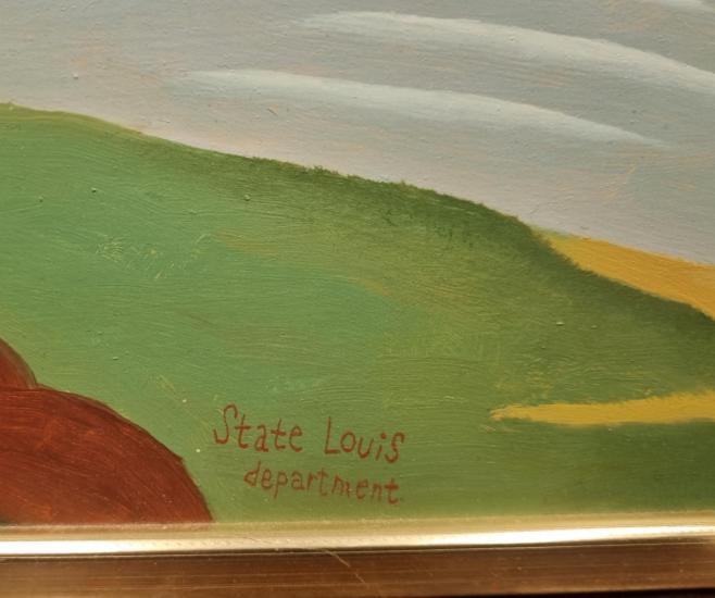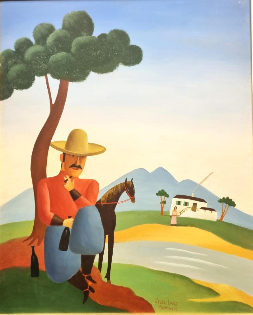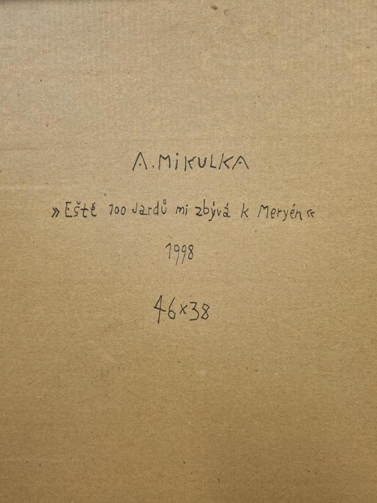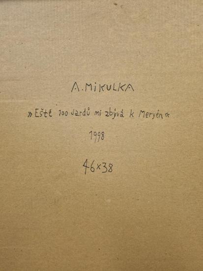 Krásná malba od Aloise Mikulky. Muž s kloboukem sedí pod stromem a odpočívá po dlouhé ceště. Už se skoro u své milé, která ho vyhlíží z druhé strany břehu. Mikulka vytváří krásné promalované barevné plohy, které vynikají svojí čistotou, jemnými odchylkami v odstínech stínuje plochy a drobnými linkami doplňuje detaily. Olej na kartonu, rámováno, rozměry s rámem 48 x 39 cm, rozměry díla 46 x 36 cm. Signováno dole uprostřed "State Louis department", ze zadní strany "A. Mikulka 98".