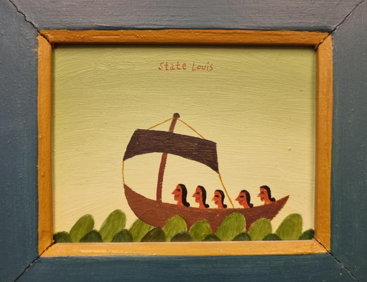 Drobný obraz od Aloise Mikulky. V díle sledujeme jednoduchý výjev loďky, která pluje po rozvlněném moři, na palubě, v řadě za sebou, sedí pět stejných žen. Mikulka využívá svůj oblíbený princip opakování totožného námětu v rámci jednoho díla, čímž v díle utváří rovinu univerzality, zároveň je to prvek, který je často nositelem vtipu. Olej na sololitu, rámováno, rozměry s rámem 17 x 20 cm, rozměry díla 12 x 9,5 cm. Signováno nahoře uprostřed "State Loius" a ze zadní strany "A. Mikulka, Exodus, 1989".
