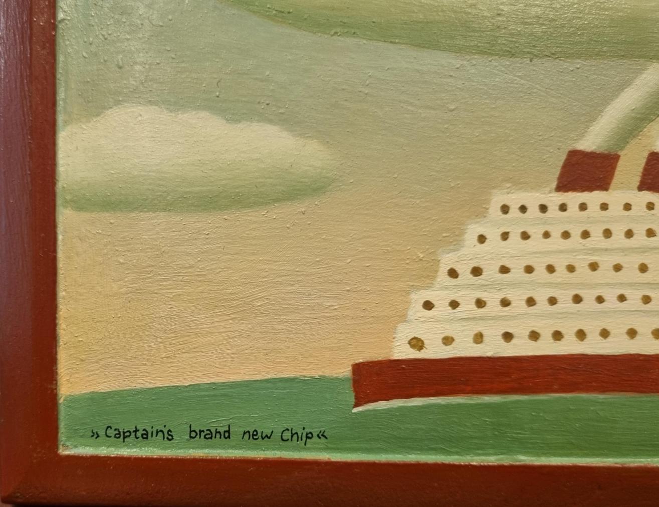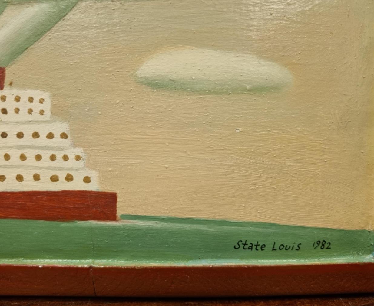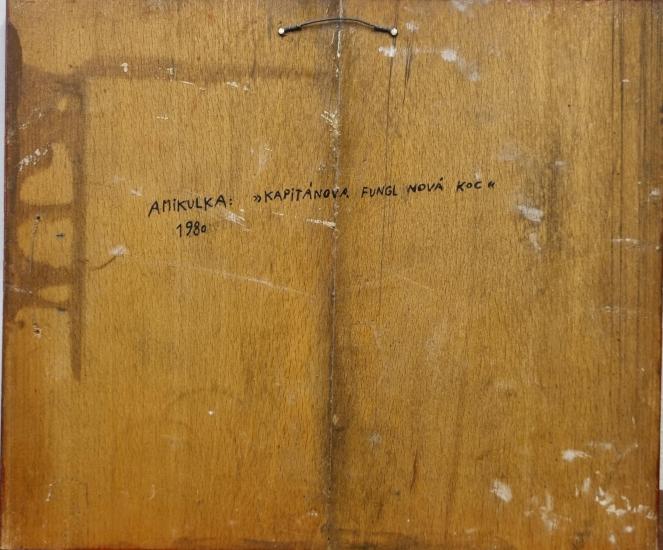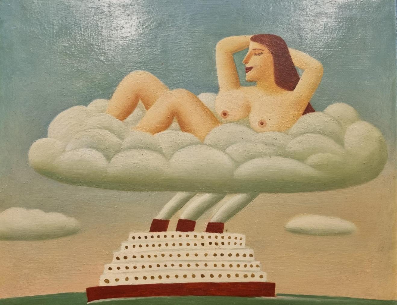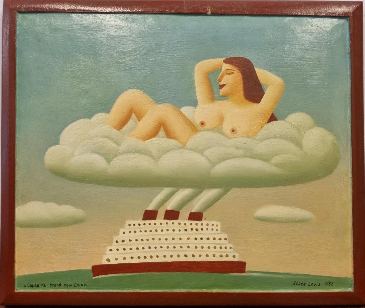 Krásná, hravá malba od Aloise Mikulky. V díle najdeme parník plující po moři, z kterého stoupá pára. Páry je na nebi tolik, že se z ní stává nadýchaná peřina, ve které si hoví nahá žena, milenka kapitána. Mikulka rozvíjí fantazii kolem jednoduchého námětu, vtip dokresluje samotným názvem díla. Olej na dřevě, rozměry 27 x 23 cm. SIgnováno vpravo dole "State Louis", ze zadní strany "A. Mikulka".