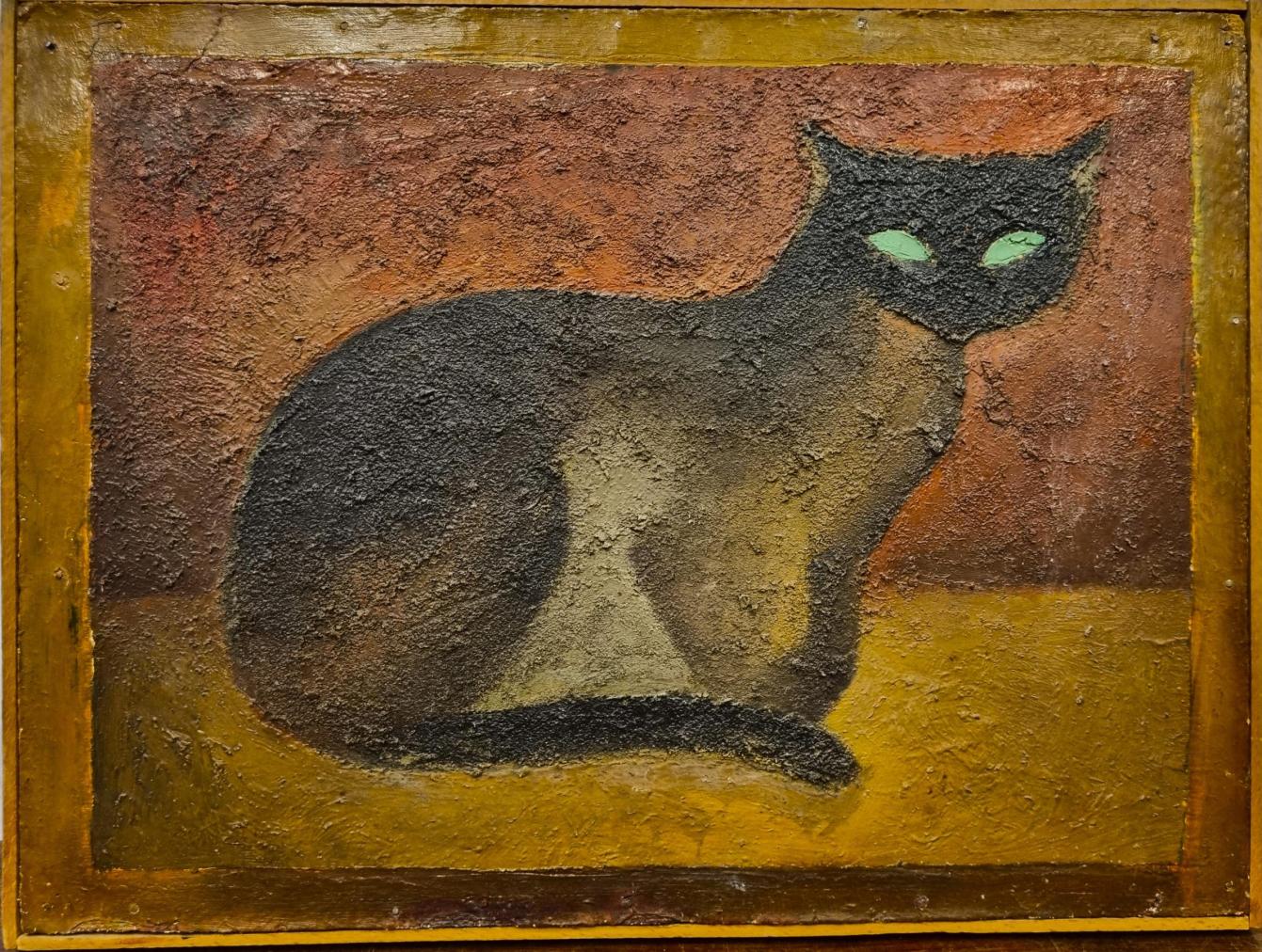 Dílo od Aloise Mikulky s námětem kočky na červeném pozadí. Dílo je pro Mikulku netypicky sktrukturální, celé dílo pokrývá hrubé zrno, pouze v místech zářivě zelených očí nechává malbu bez struktur. Stroktura vytváří lehce reliéfní charakter. Z druhé strany malby je portrét, viz foto. Kombinovaná technika na dřevě, rámováno, rozměry s rámem 42 x 31 cm, rozměry díla 40 x 30 cm. Nesignováno.