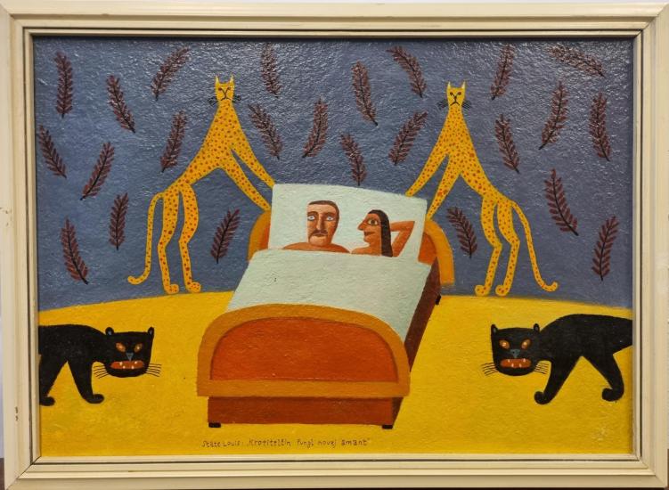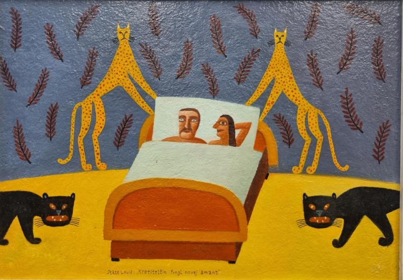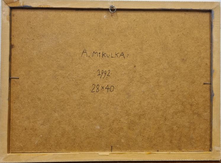 Skvělé dílo od Aloise Mikulky. Názvy i motivy, které Mikulka vybírá, mají jasnou, ilustrativní rovinu. V jeho díle hraje velkou roli symetrie, která je vizuálně velmi příjemná a zároveň prostá. V jednoduchosti tkví Mikulkovo kouzlo, hraje si s náměty, vkládá do nich vtip, to vše prostřednictvím osobitého rukopisu. Olej na sololitu, rozměry s rámem 44 x 32 cm, rozměry díla 40 x 28 cm. Signováno předu dole "State Louis" a ze zadí strany "A. Mikulka 1992".