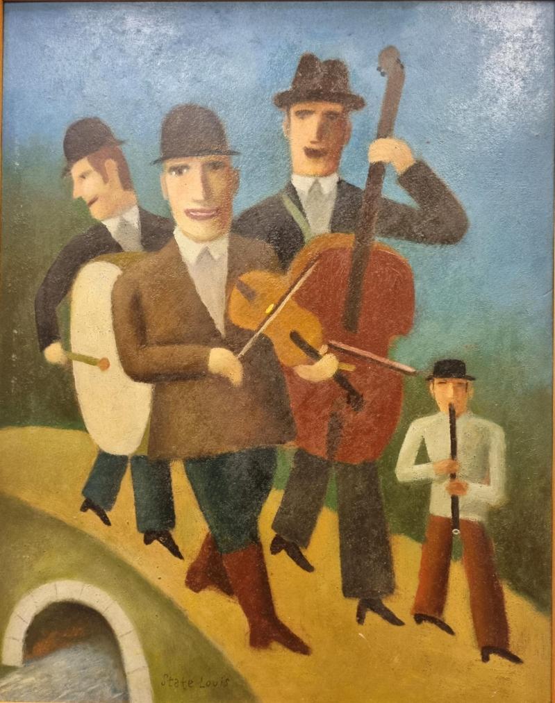 Obraz od Aloise Mikulky. Po mostě kráčí skupinka hudebníků, každý z nich má svůj hudební nástroj. Mikulka si typicky hraje s perspektivou, v díle vnímáme prostor díky použitým zkratkám a zjednodušení. Postava vpředu je komicky malá oproti ostatním. Olej na kartonu, rámováno, rozměry s rámem 47 x 37 cm, rozměry díla 44 x 34 cm. Signováno v pravém dolním rohu "State Louis".