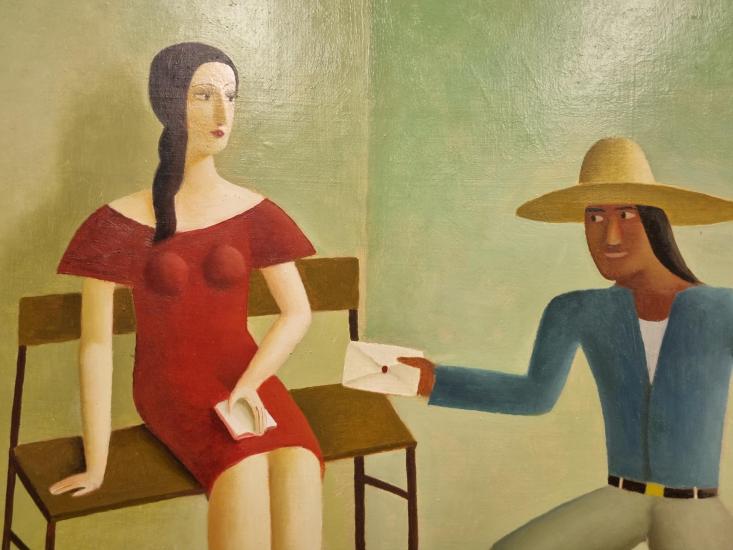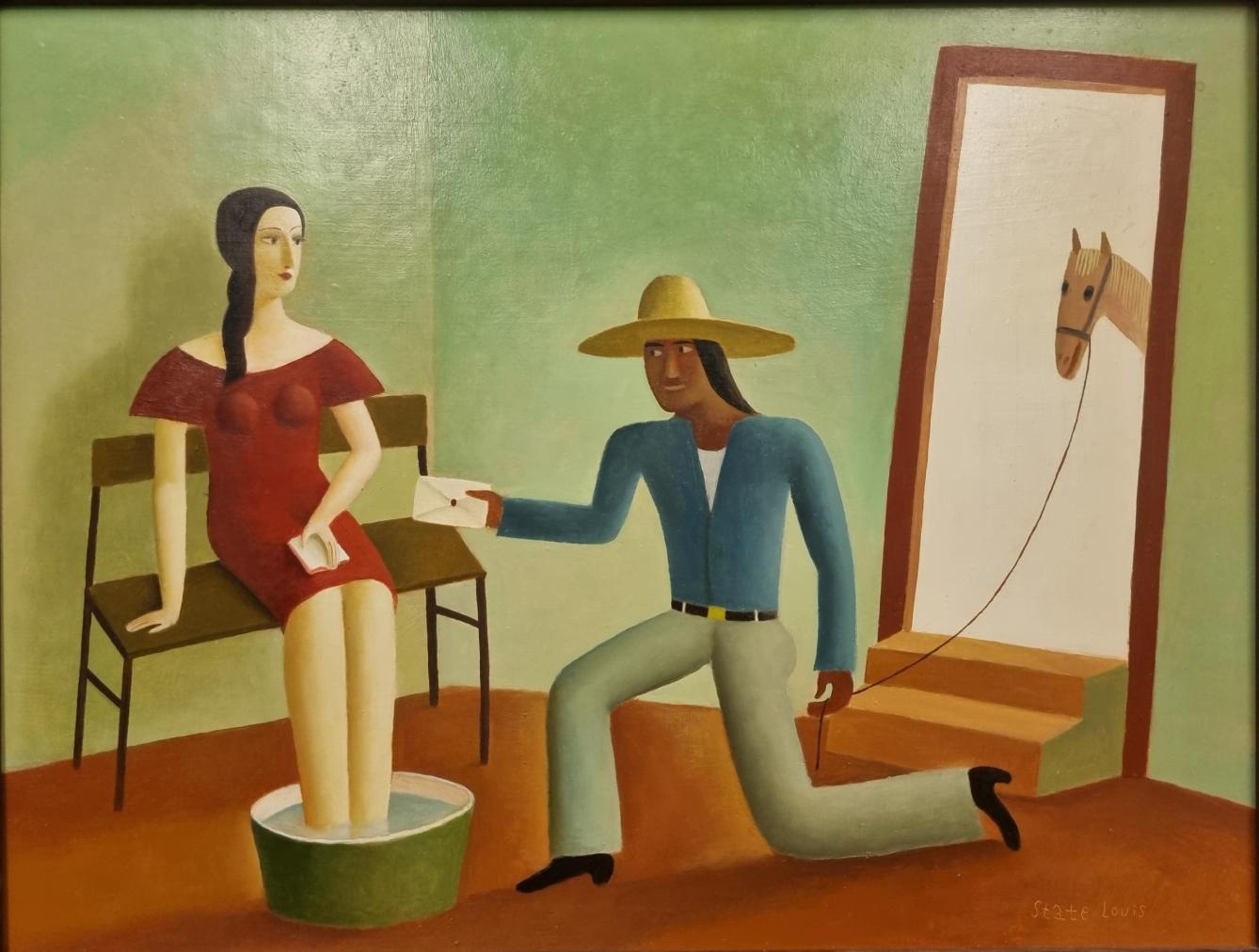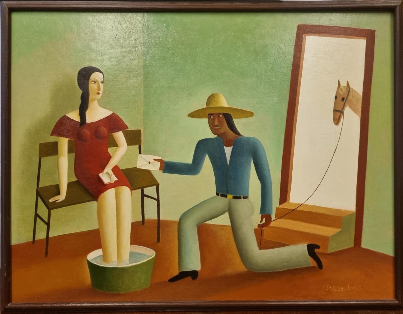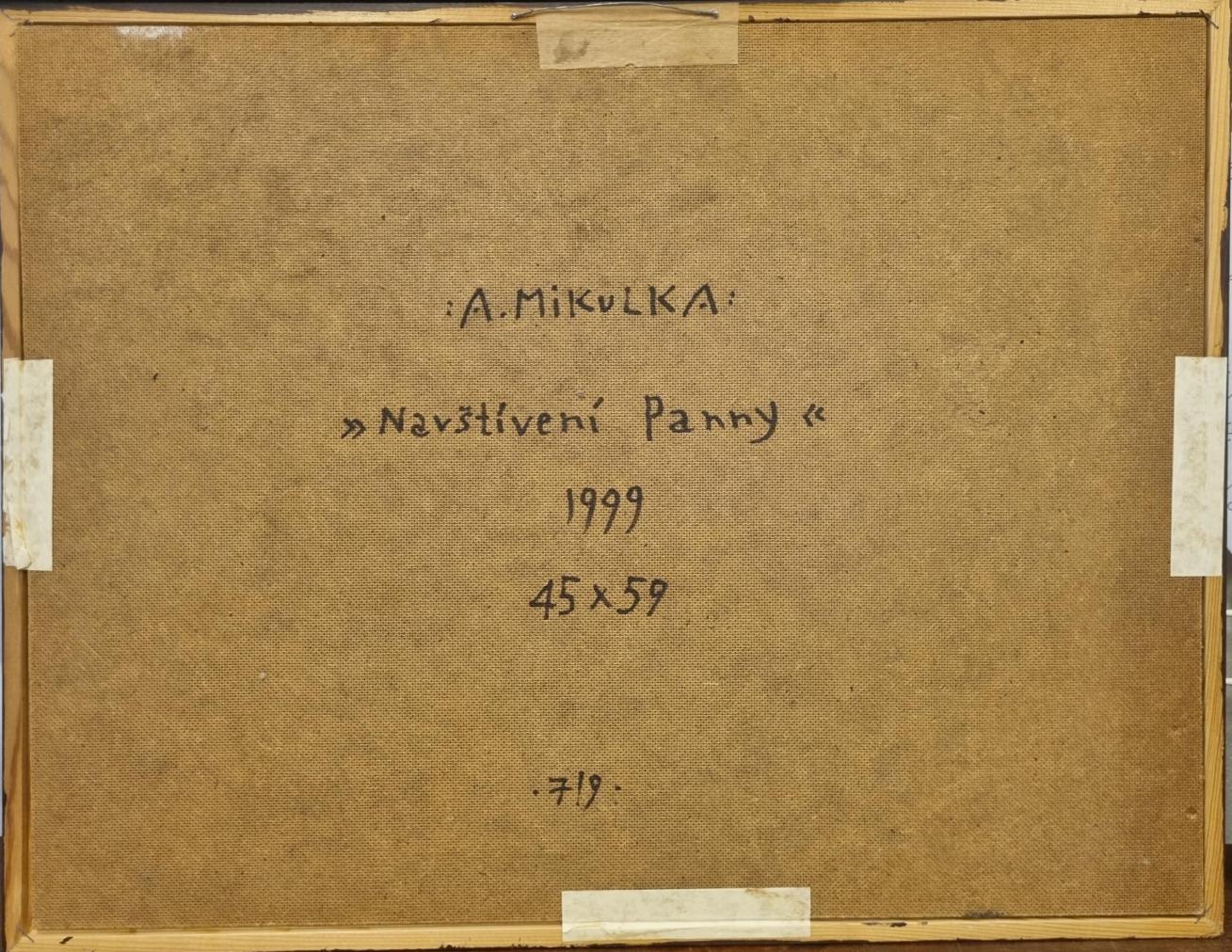 Malba od Aloise Mikulky, kterou nazval Navštívení panny. V díle se rozprostírá hráškově zelený interiér, který zeje prázdnotou. V místnosti je pouze lavice, na které sedí žena a užívá si chvilku odpočinku s nohama v lavoru. Muž přichází zvenku a na provázku drží koně. Mikulka skládá čisté, syté plochy vedle sebe. Olej na sololitu, rámováno, rozměry s rámem 61 x 47 cm, rozměry díla 59 x 45 cm. Signováno vpravo dole "State Loius" a ze zadní strany "A. Mikulka, Navštívení panny, 1999".