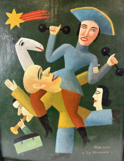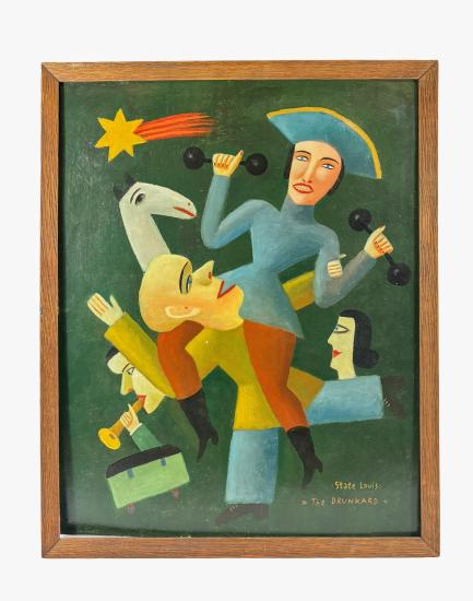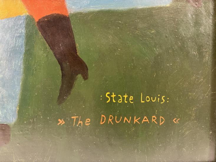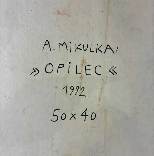Komické dílo od Aloise Mikulky s názvem Opilec. V díle vytváří výjev bujaré zábavy, v centru díla se nachází opilec, kolem kterého se točí veškerá zábava. Postavy mají komické výrazy a každá z nich se věnuje jiné aktivitě. Autor volí specifickou barevnost a svým osobitým stylem za pomocí jemného stínování vytváří uhlazenou malbu. Malba na kartonu, rámováno, rozměry s rámem 53 x 42 cm, rozměry díla 50 x 40 cm. Signováno v pravém dolním rohu a ze zadní strany "A. Mikulka, Opilec, 50 x 40".