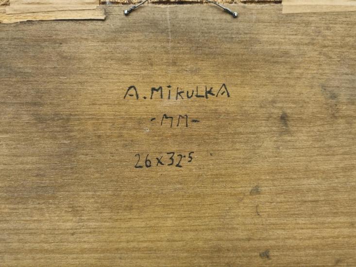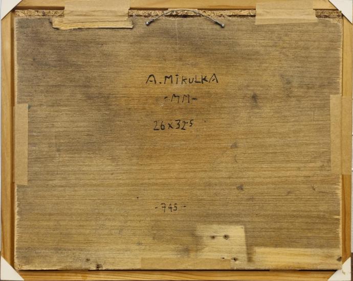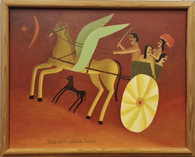 Malba od Aloise Mikulky s názvem Východ slunce. Mikulka je mistr barevných přechodů, gradienty používá i v místech stínování ploch. Námět je klasicky milý, lehce pohádkový, Pegas zrovna vzlétá a míří vzhůru. Muž, který Pegase ovládá je v obložení třech dam. Olej na překližce, podloženo dřevem, rámováno, rozměry s rámem 35 x 29 cm, rozměry díla 26 x 32,5 cm. Signováno vpředu "State Loius" a ze zadní strany "A. Mikulka, M M".