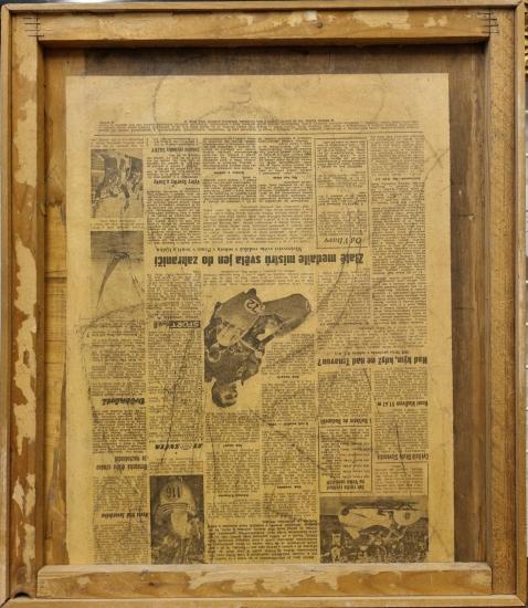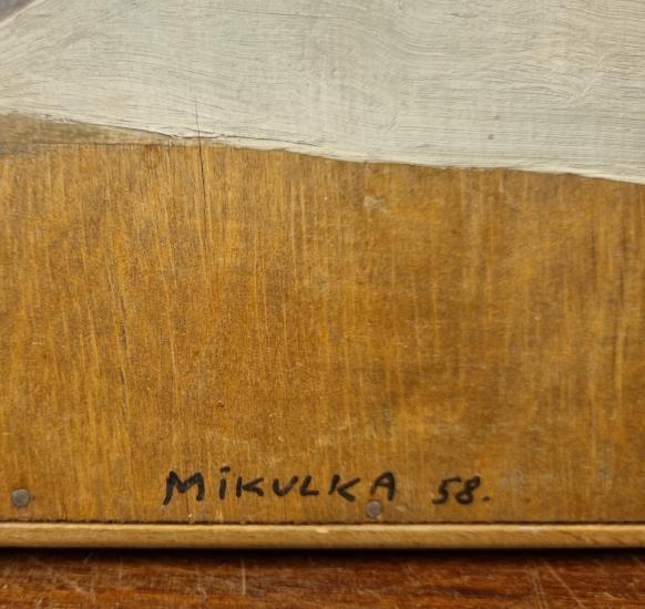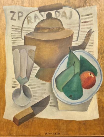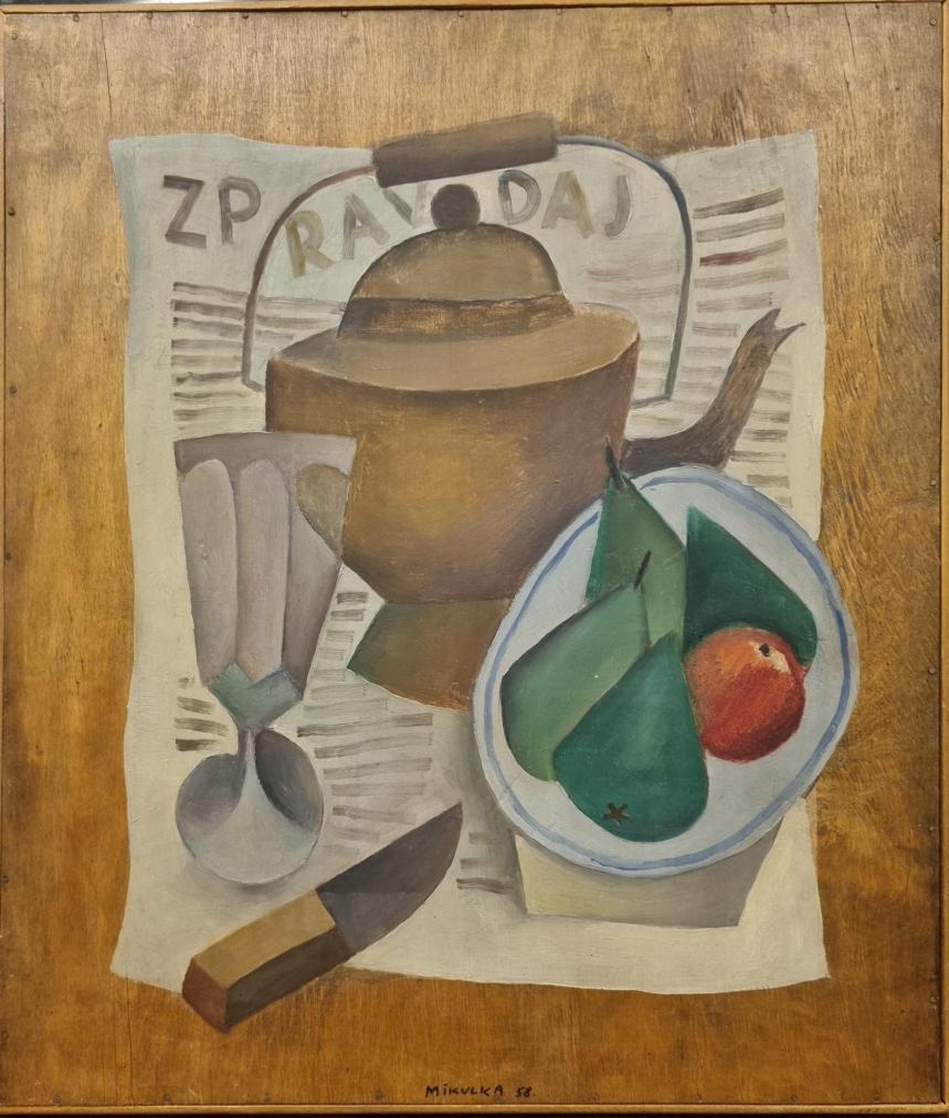 Dílo z období rané tvorby Aloise Mikulky. Autor pojímá klasický formát zatiší po svém, pracuje zajímavým způsobem s perspektivou, v díle se předměty prolínají a zaniká v něm hloubka prostoru. Formálně lze vnímat rozvíjející se Mikulkův rukopis v podobě plošnosti malby a čistých, promalovaných ploch. Olej na dřevě, rámováno, rozměry s rámem 49 x 42 cm, rozměry díla 47 x 41 cm. Signováno dole uprostřed "Mikulka 58".