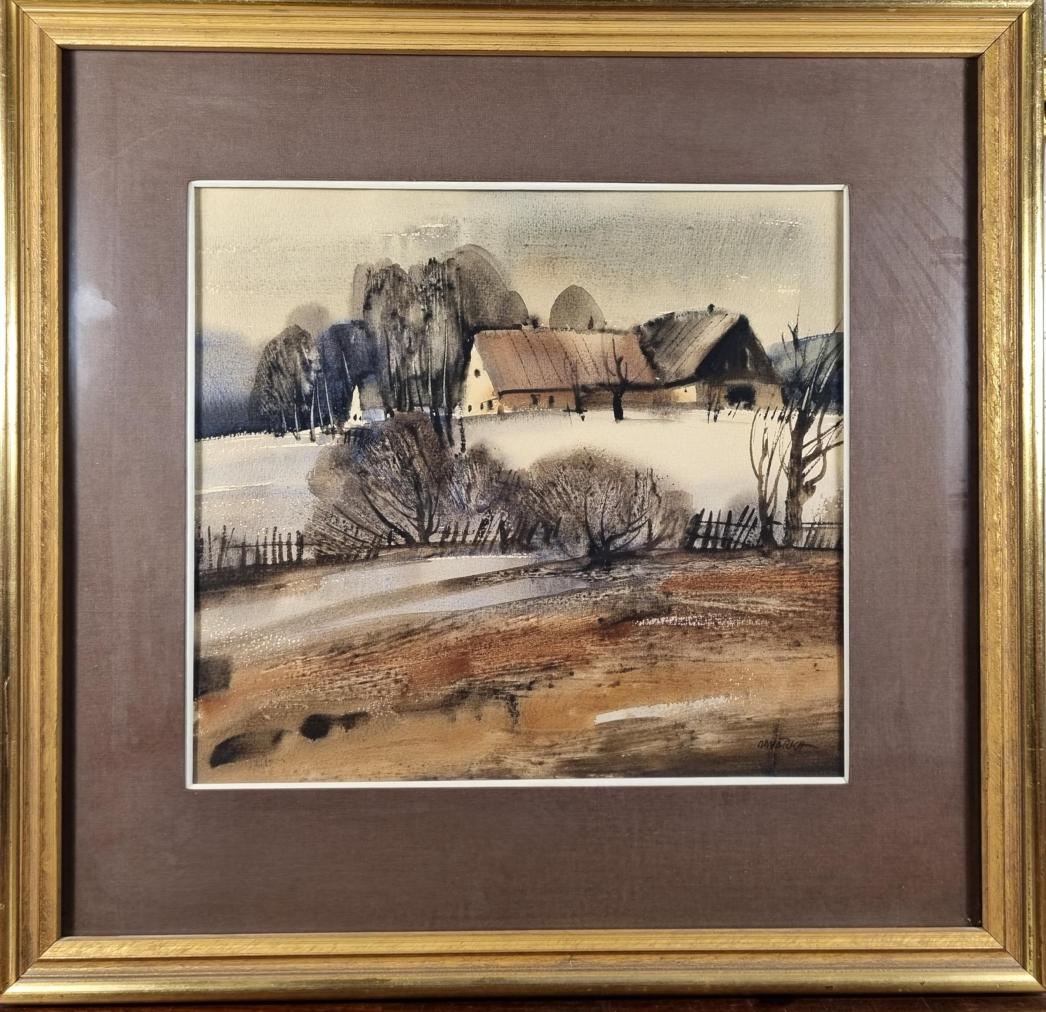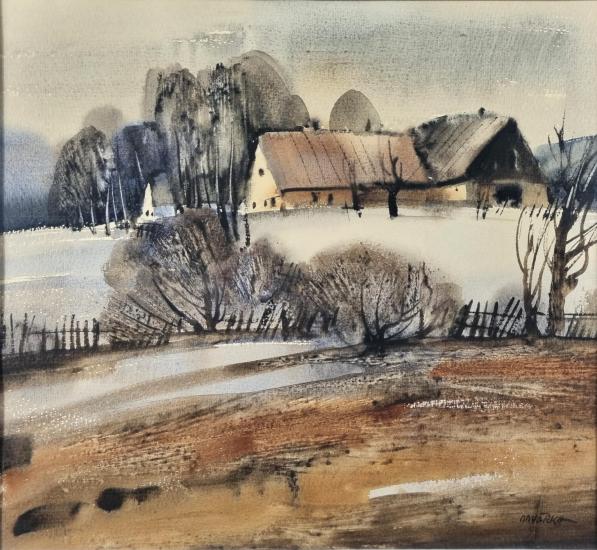 Klasické dílo od Jana Odvárky. Za pomocí techniky akvarelu dokáže vystihnout zimní krajinu, ve které začíná pomalu tát sníh a mění se v kaluže. Právě rozpité plochy perfektně vystihují podobu a atmosféru pozdně zimních dnů, kdy sníh mizí a objevuje se krajina, která byla doposud schovaná. Akvarel na papíře, rámováno pod sklem, rozměry s rámem 52,5 x 50,5 cm, rozměry díla 33 x 30 cm. Signováno vpravo dole "Odvárka".