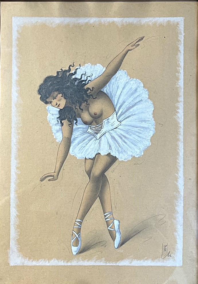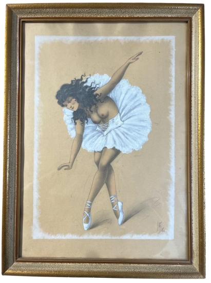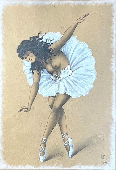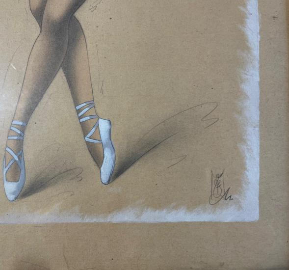 Akt baletky v pohybu, s rozevlátými hustými vlasy a načechranou sukní, od umělce Jaroslava Štiky. Autor využívá světla a stínu k vytvoření hmoty a jemným tónováním dodává dílu živost. Výrazným konturováním a dynamickými pohybovými liniemi okolo, vytváří efekt nadčasové ilustrace. Kombinovaná technika na žlutém papíře. Zarámováno, pod sklem. Signatura se nachází na pravé straně dole- monogram Jaroslav Štika. Papír je v horní části lehce zvlněný. Rozměry díla jsou 34 x 49 cm. Rozměry s rámem jsou 40 x 55 cm.