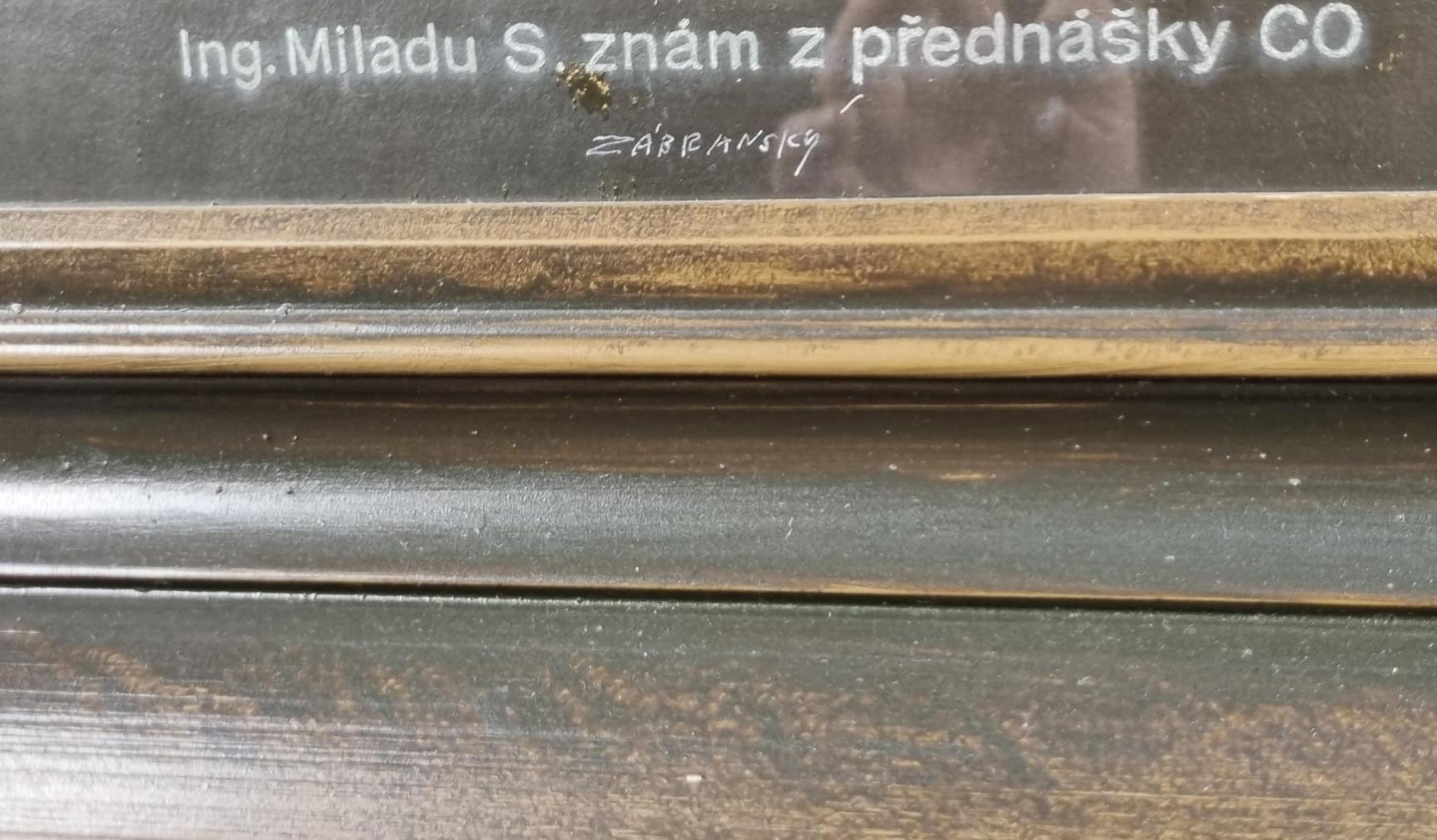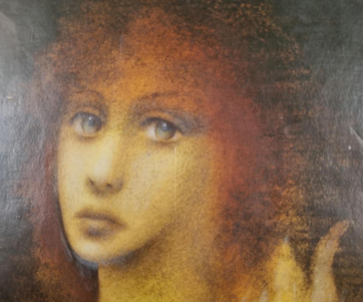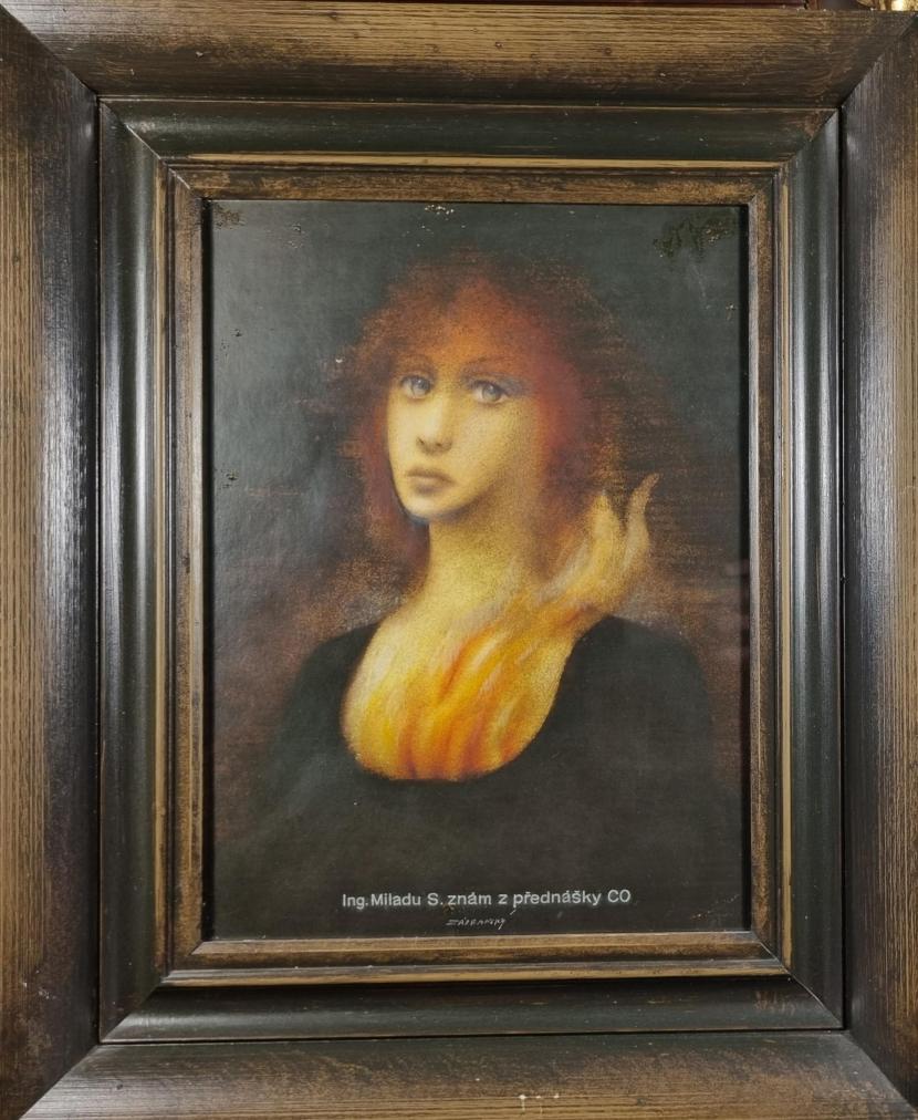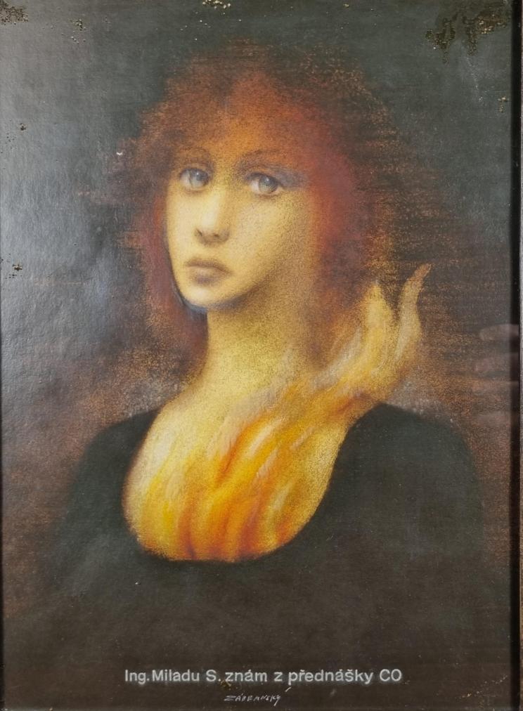 Malba od Vlastimila Zábranského s námětem portrétu ženy. V tmavém oparu do centra obrazu situuje ženu, která se dívá odevzdaně před sebe. Na hrudníku má žena plameny, které plápolají v ohnivých odstínech. Kombinovaná technika na kartonu, rámováno pod sklem, rozměry s rámem 55,5 x 45,5 cm, rozměry díla 38 x 28 cm. Signováno uprostřed dole "Zábranský". Rám lokálně poškozen.