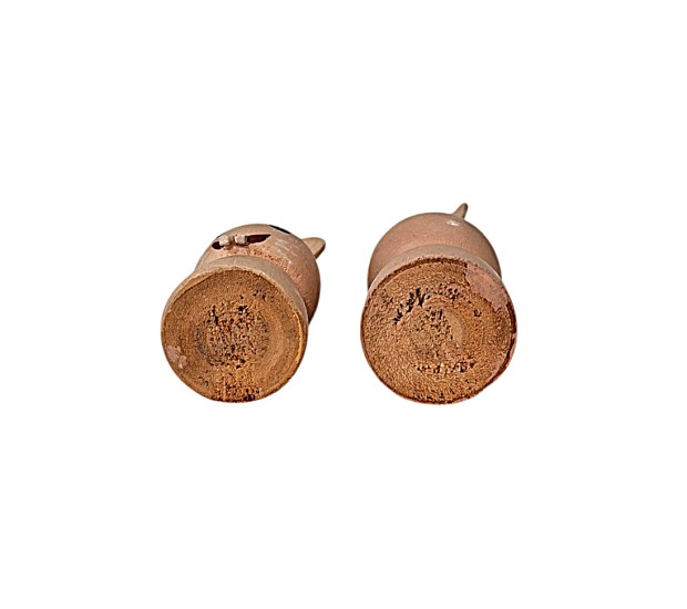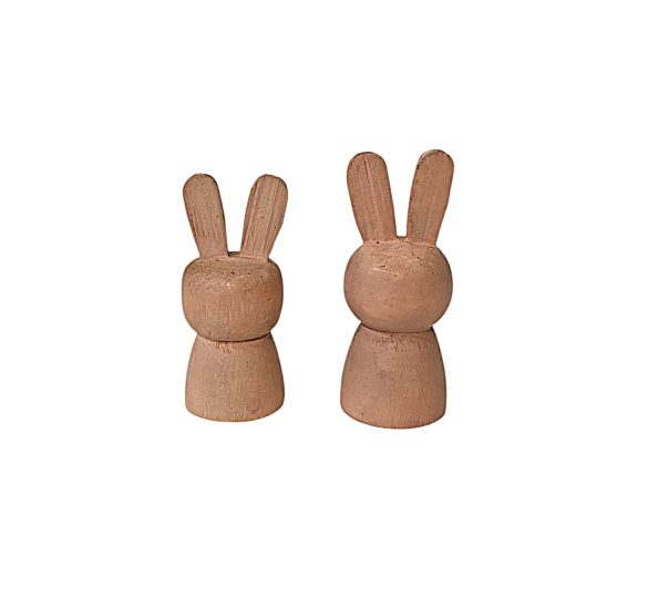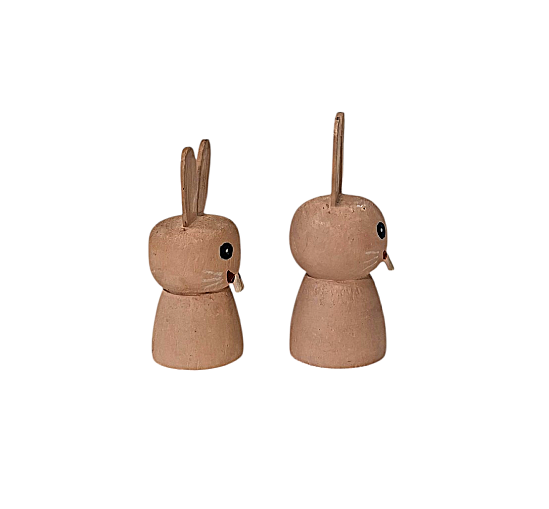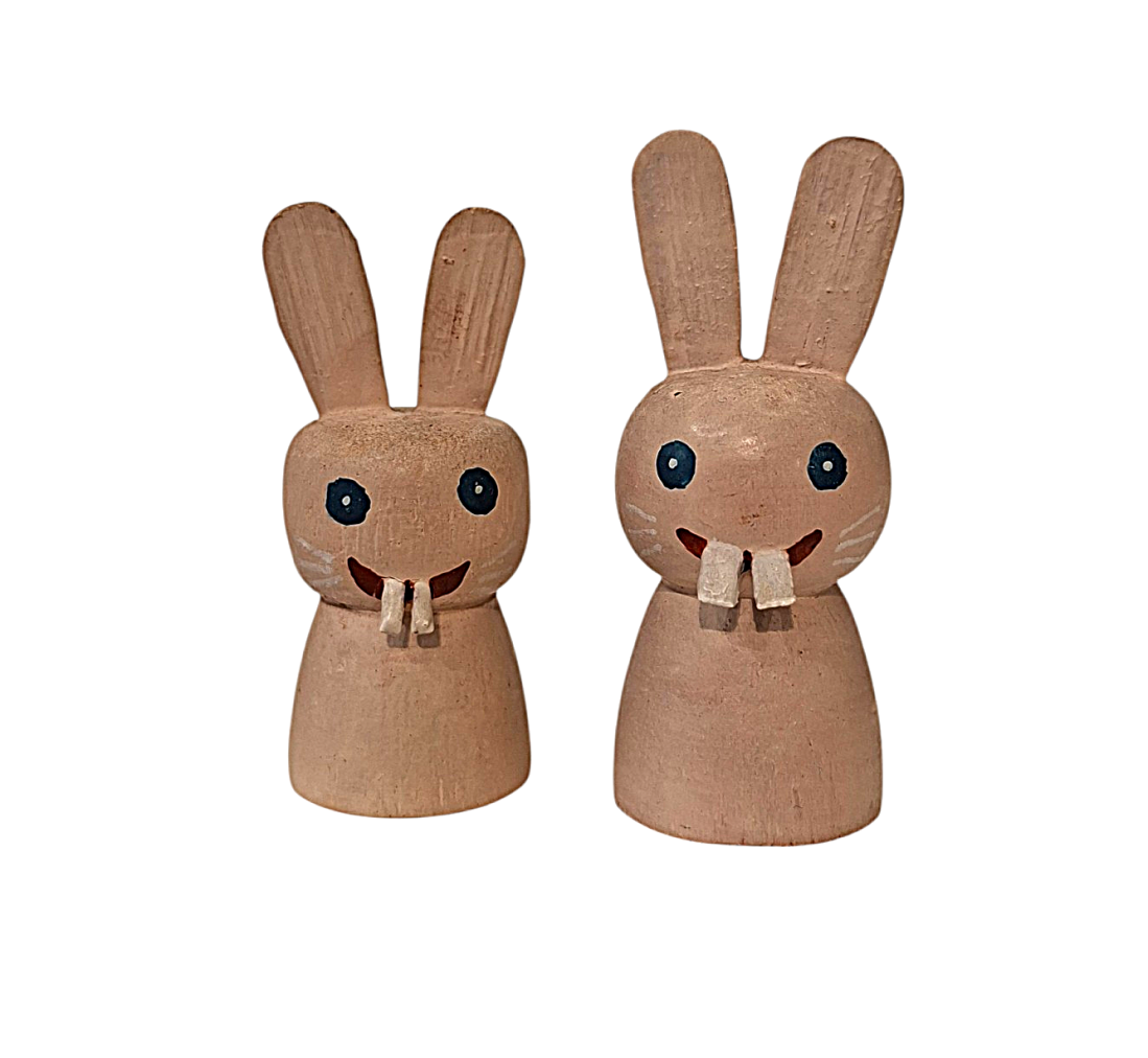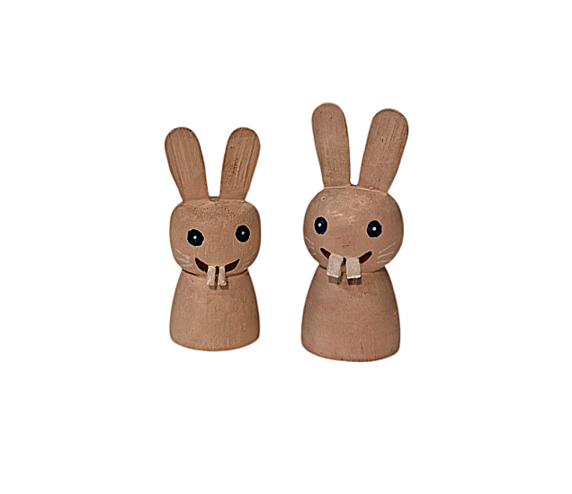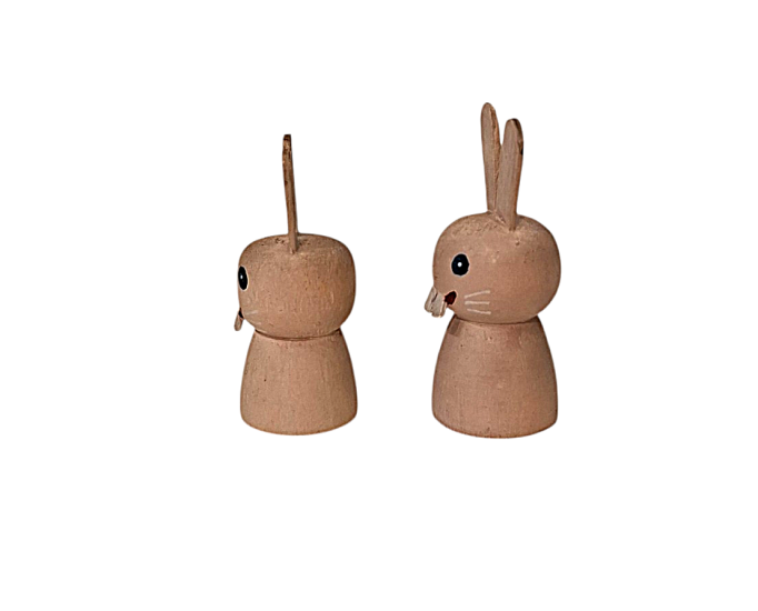 Veselí zubatí králíci, malovaní na dřevě. Větší má výšku 6 cm, šířku 2,5 cm, menší má výšku 5,5 cm a šířku 2 cm. Nesignováno.