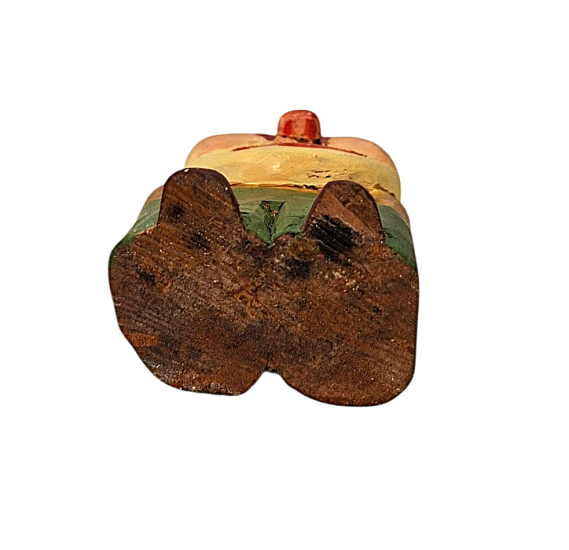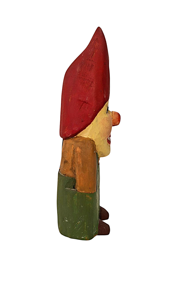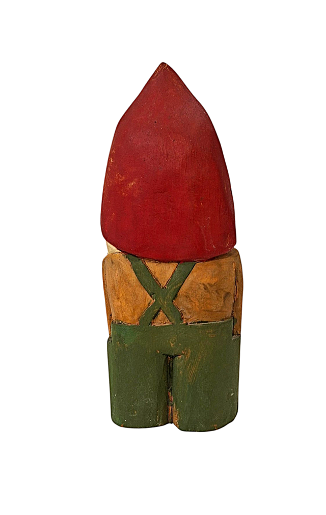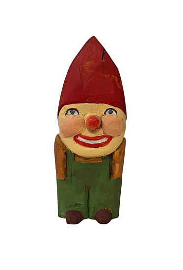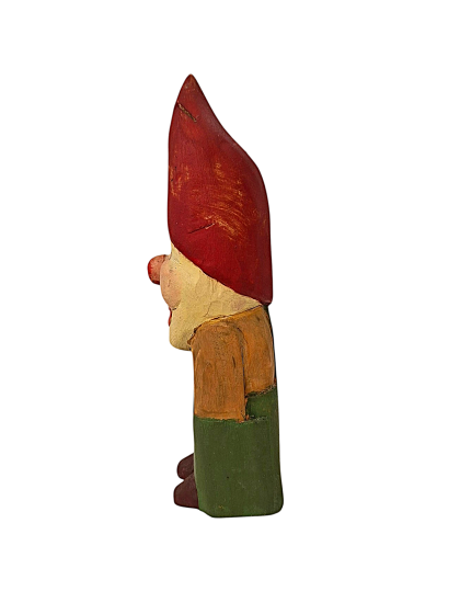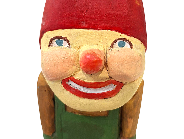Usměvavý trpaslík v zelených kalhotách a s červenou čepičkou. Malováno na dřevě. Výška 15 cm, šířka 6 cm, hloubka 4,5 cm. Nesignováno.