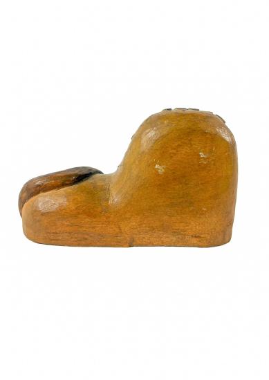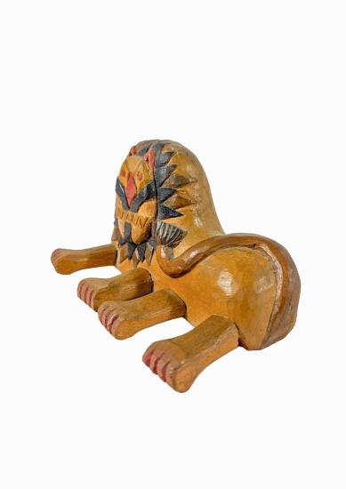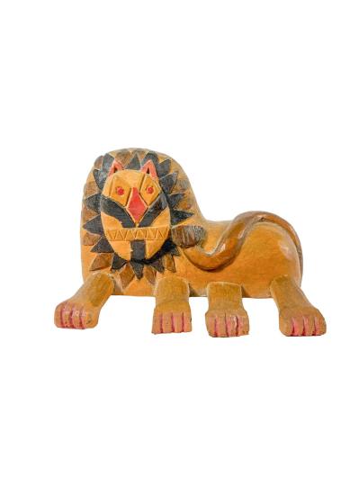 Drobná soška od Aloise Mikulky v podobě ležícího lva. Umělec vytváří základní figuru lva za pomocí zjednodušených, oblých křivek. Do těch pak zasauje detaily geometrického rázu, které vybarvuje různými odstíny. Tlapy koloruje růžovou barvou, což je drobný a příjemný detail. Dřevo, výška 6 cm, hloubka 6,5 cm, délka 10 cm. Neznačeno.