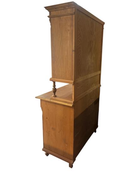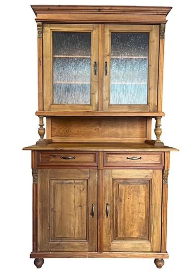 Starožitný selský příborník z měkkéhodřeva. Částečně restaurovaný a předělaný na modrní způsob / šuplíky s pojezdy.../. Na výšku měří 204 cm. Šířka spodní části je 112 cm, hloubka 58 cm. Hloubka horní části je 33 cm. Povrchová úprava je místy ošoupaná, na pravé straně nahoře dva vrypy ve dřevu. Možno rozdělat na dva kusy.