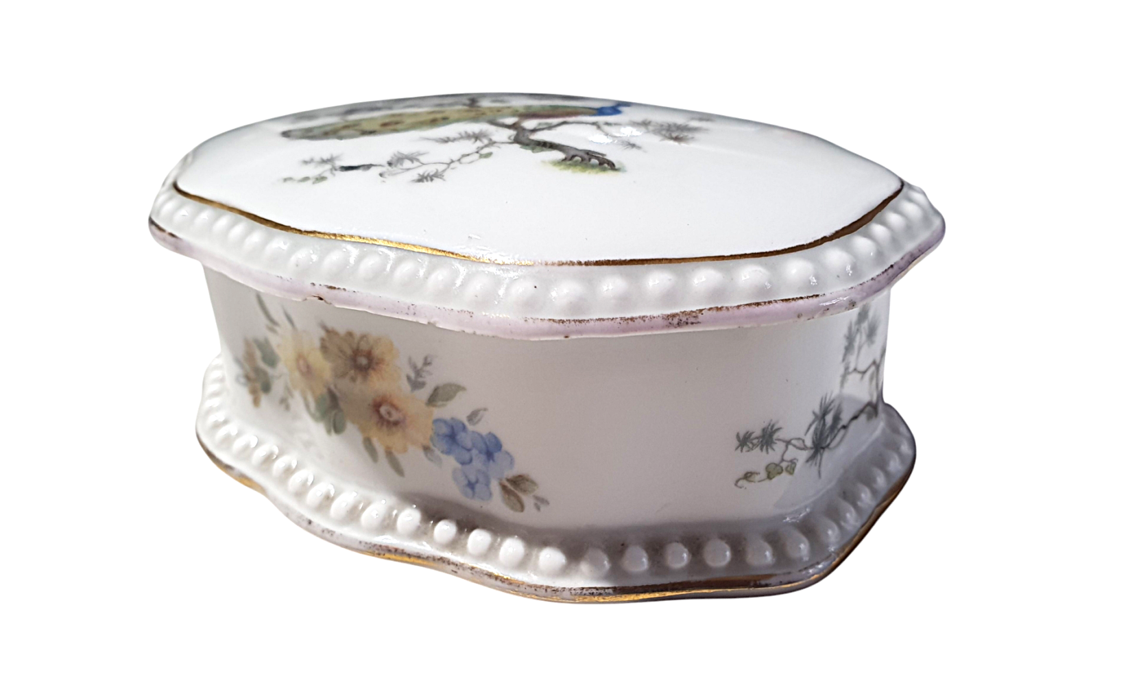 Krásná malá dózička s motivem páva a květin. Výška včetně víka je 4,5 cm, šířka je 10,5 cm. Zlacení je místy setřeno. Značeno Rosenthal.