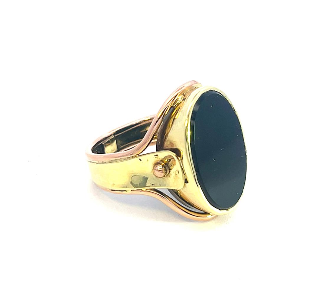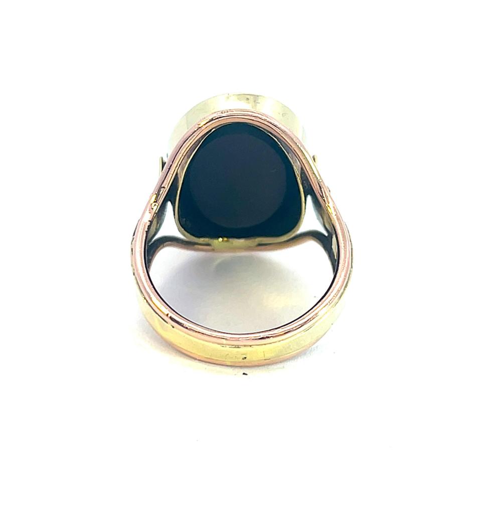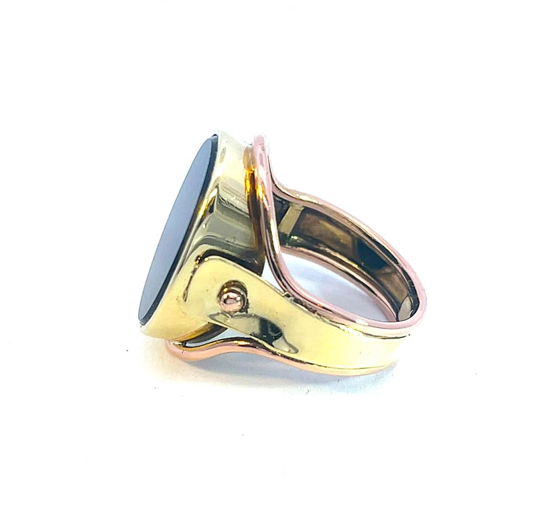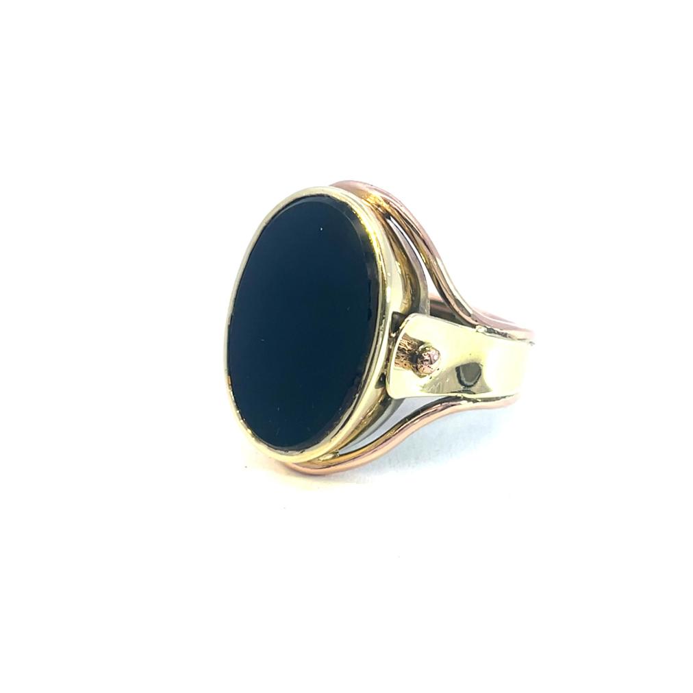 Masivní zlatý pánský prsten s černým kamenem. Žluté a růžové zlato o ryzosti 585/1000 s puncem labuť. Velikost prstenu 63, váha 11,20 g. Rozměry hlavy prstenu jsou 25 x 20 mm. Šířka šíny je 6 mm. Kámen je syntetický.