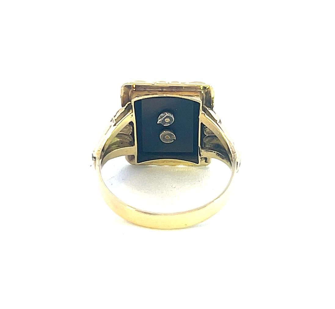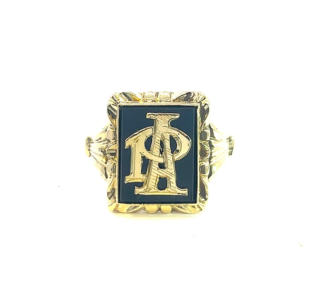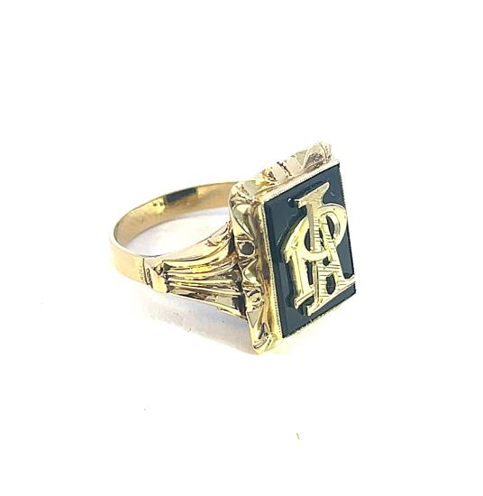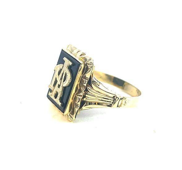 Zlatý pánský prsten s monogramem a onyxem. Zlato o ryzosti 585/1000 punc lvíček. Velikost prstenu 63. Váha 5,62g. Rozměry hlavy prstenu jsou 15 x 18 mm. Šířka šiny je 3 mm. Kámen je syntetický.
