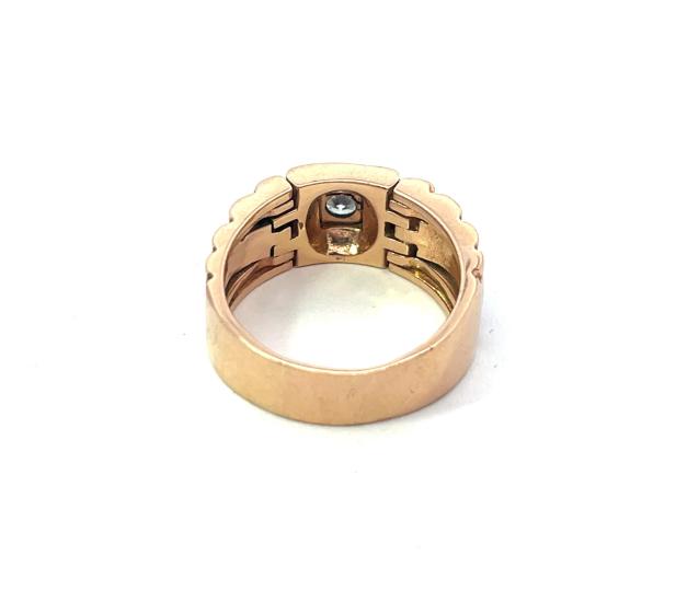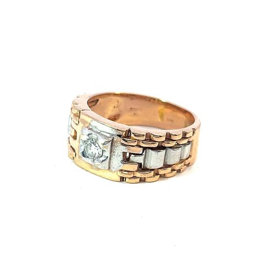 Prsten z kombinace růžového a bílého zlata o ryzosti 585/1000, punc labuť. Váha 16,03 g, velikost 67, v nejširším bodě 11 mm. Kámen - přírodní diamant briliantového brusu - 1 ks, cca 0,20 ct.