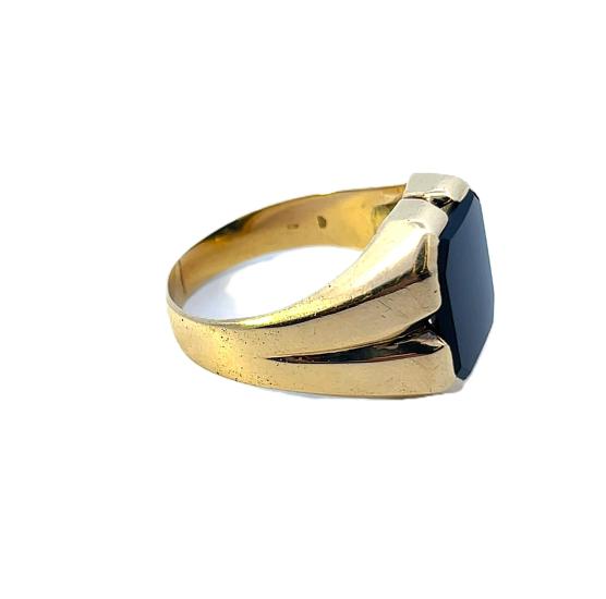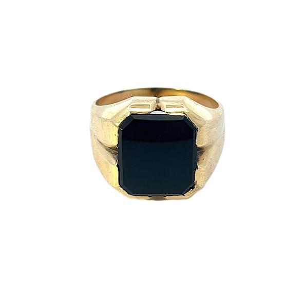 Zlatý prsten s onyxem pánský, ryzost 585/1000, punc labuť, vel. 69, váha 12,2 g, v nejširším bodě 18 mm.