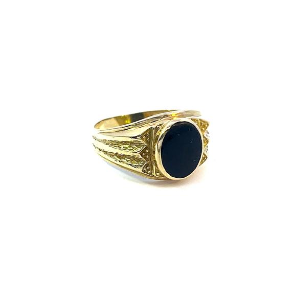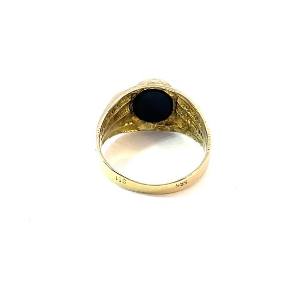 Zlatý prsten o ryzosti 585/1000, punc labuť. Velikost 61, váha 5,02 g, v nejširším bodě 13 mm. Kámen nese známky opotřebení.