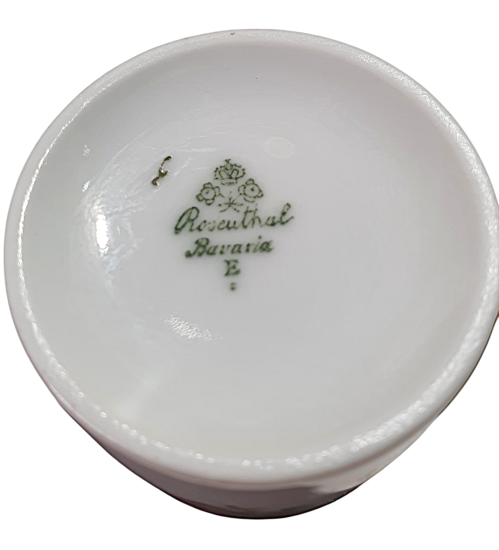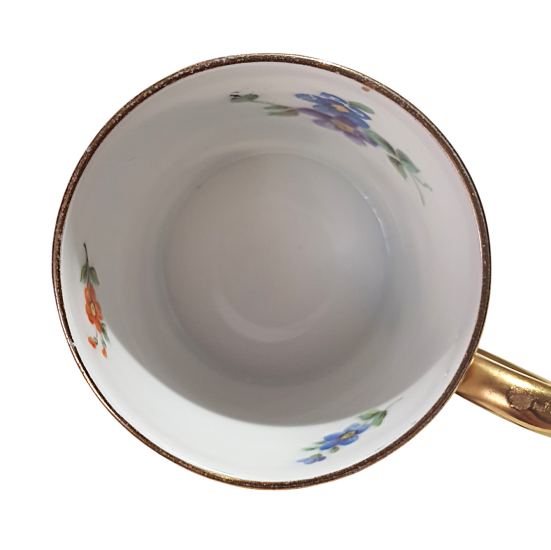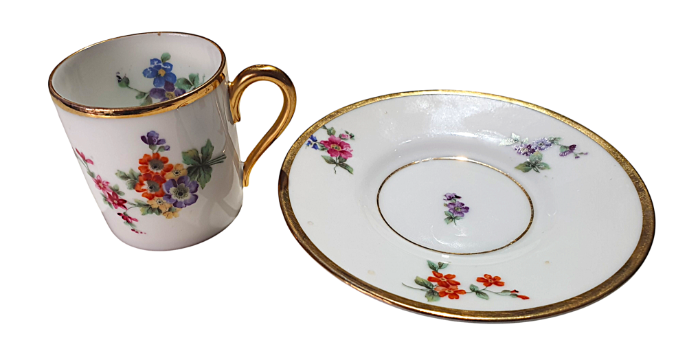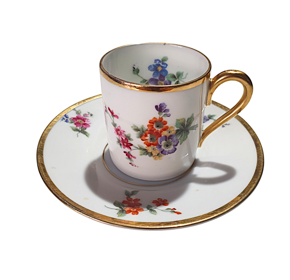 Zlacený šálek s podšálkem s květinovým motivem. Výška šálku je 5 cm, šířka podšálku je 10,8 cm. Značeno Rosenthal. Zlacení je místy lehce odřeno.
