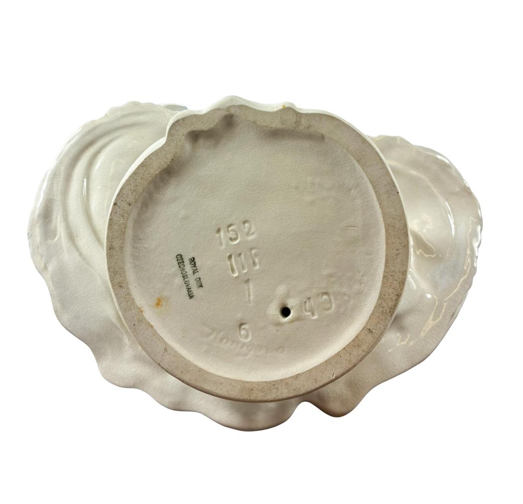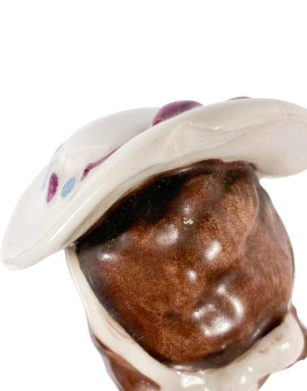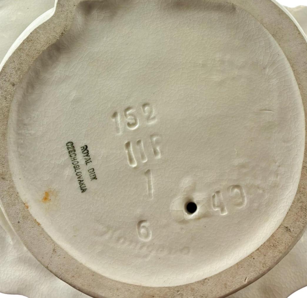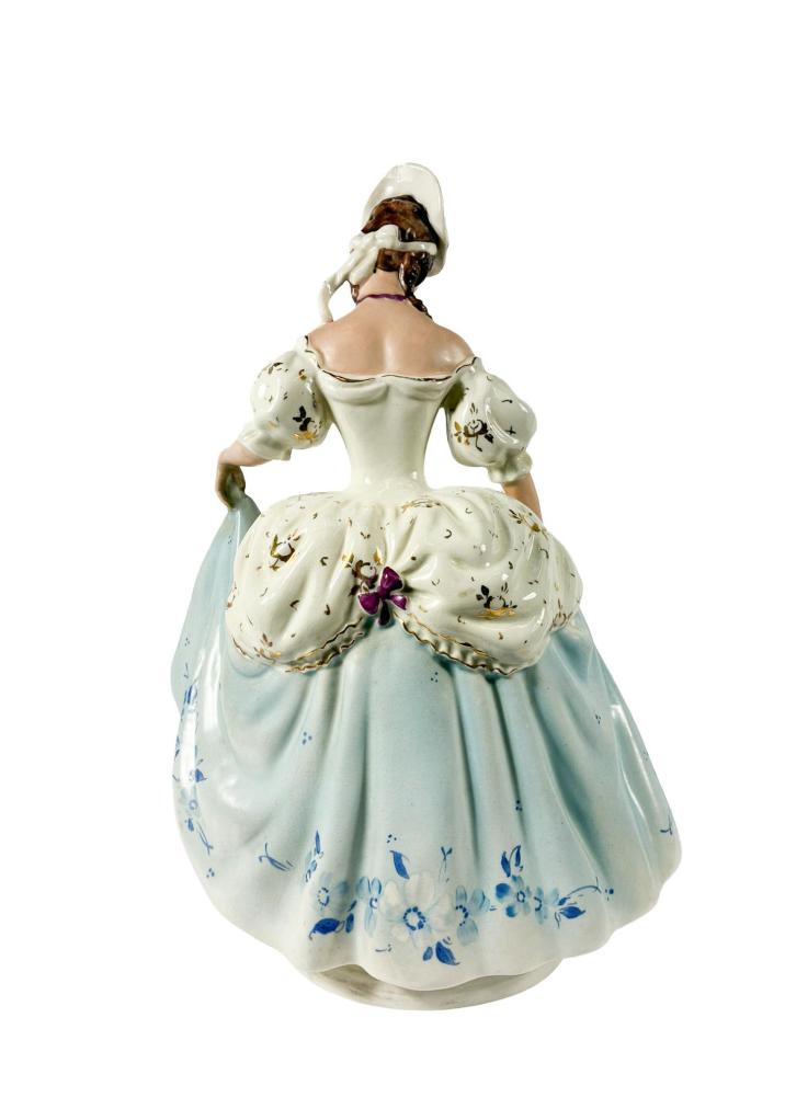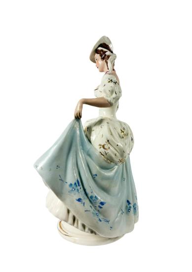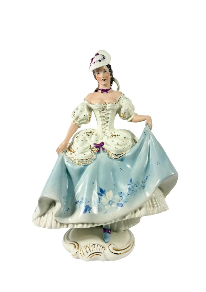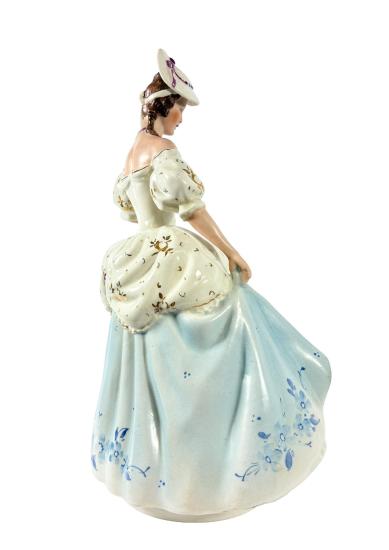 Krásná porcelánová soška dámy v modrých šatech. Šaty zdobí jemná kvítka, bílá část je zdobená zlacením. Výška 31 cm, v nejširším bodě 21 cm. Na klobouku ze zadní strany je oťuk, jinak je socha v pěkném stavu. Značeno vespod "Royal Dux Czechoslovakia".
