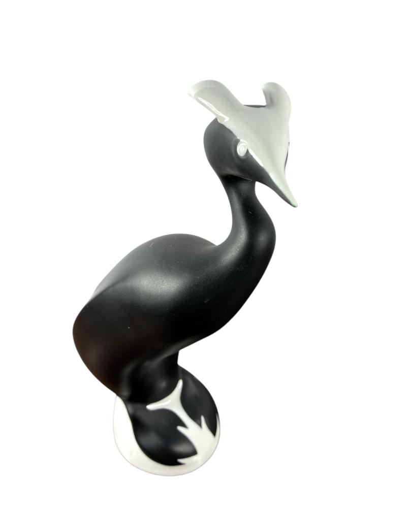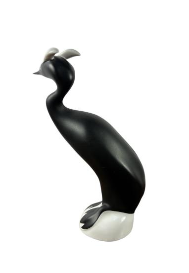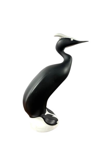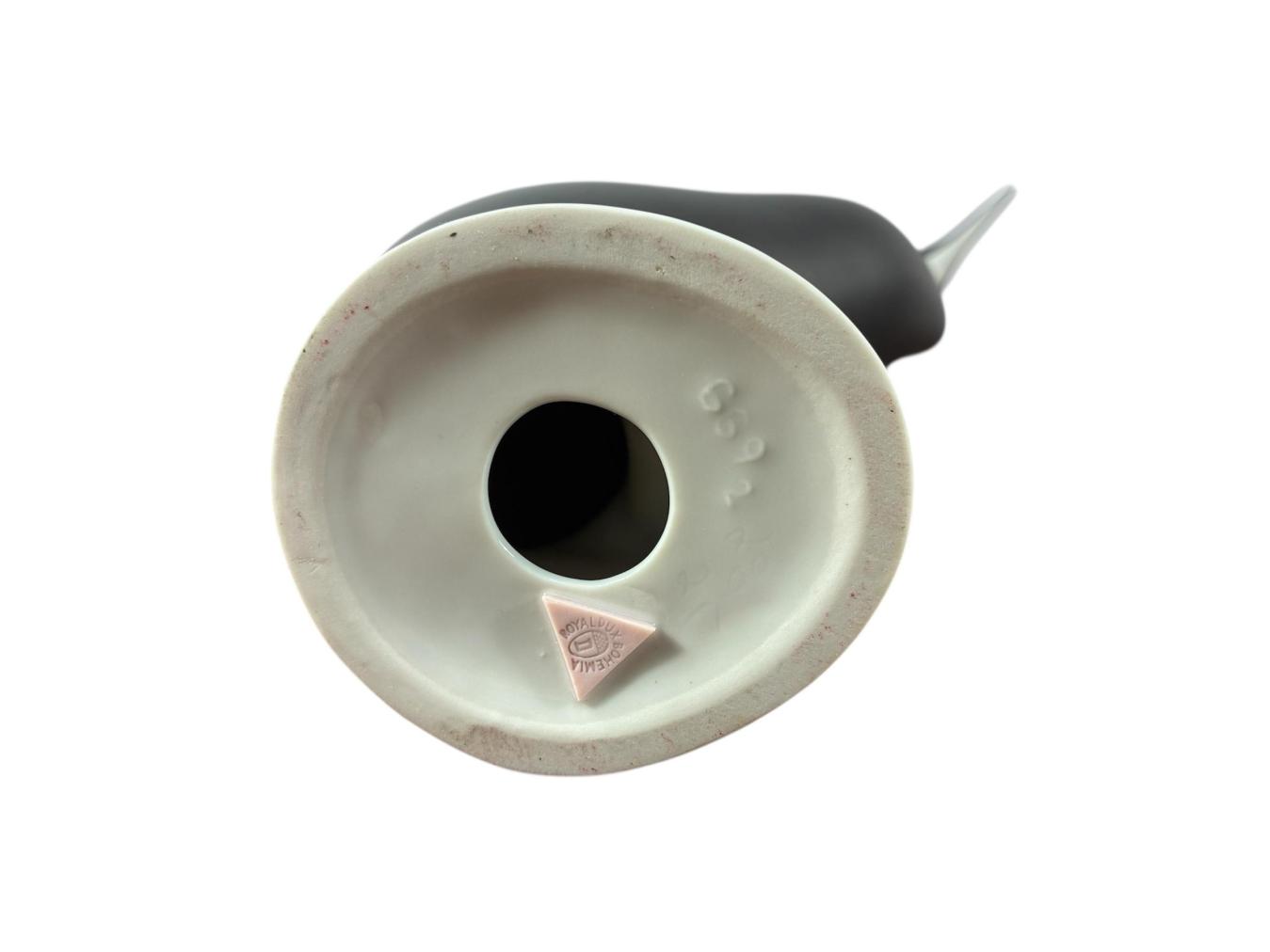 Skvělá porcelánová soška potápky v černobílém provedení od značky Royal Dux. Na minimalisticky pojaté sošce je skvělé střídaní leských a matných ploch. Výška 23 cm, rozměr podstavy 7,5 x 6 cm. Značeno vespod - růžový trojúhelník Royal Dux. Na černé ploše je pár velmi jemných rýh.