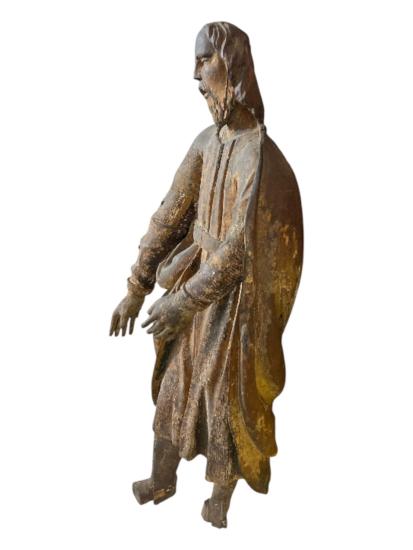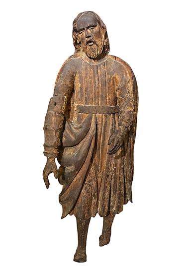 Starožitná, ručně vyřezávaná socha muže. Velká část sochy je z jednoho masivu dřeva, pravá ruka je z druhého kusu a je připevněna k předloktí. Celková výška je 85 cm, šířka je 32 cm. Hloubka je 20 cm. Stav a poškození dřevěné sochy odpovídá stáří, chodidla jsou uštípnutá a barva/lak/povrchová úprava je na většině plochy oloupaná, případně se drolí. Ze zadní strany je dílo opatřeno šroubky a pogumovaným drátem pro zavěšení. Neznačeno.